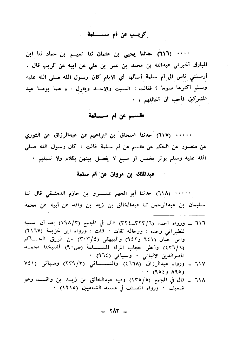 616 - حَدَّثَنَا يَحْيَى بْنُ عُثْمَانَ، ثنا نُعَيْمُ بْنُ حَمَّادٍ، ثنا ابْنُ الْمُبَارَكِ، أَخْبَرَنِي عَبْدُ اللهِ بْنُ مُحَمَّدِ بْنِ عُمَرَ بْنِ عَلِيٍّ، عَنْ أَبِيهِ، عَنْ كُرَيْبٍ، قَالَ: أَرْسَلَنِي نَاسٌ إِلَى أُمِّ سَلَمَةَ، أَسْأَلُهَا: أَيُّ الْأَيَّامِ كَانَ رَسُولُ اللهِ صَلَّى اللهُ عَلَيْهِ وَسَلَّمَ أَكْثَرَهَا صَوْمًا؟ فَقَالَتْ: السَّبْتُ وَالْأَحَدُ، وَيَقُولُ: «§هُمَا يَوْمَا عِيدٍ لِلْمُشْرِكِينَ فَأُحِبُّ أَنْ أُخَالِفَهُمْ»