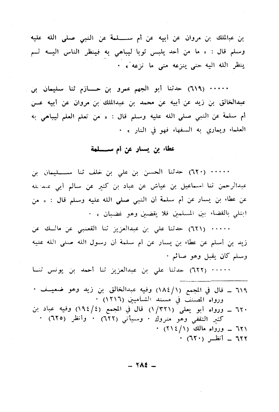 619 - حَدَّثَنَا أَبُو الْجَهْمِ عَمْرُو بْنُ حَازِمٍ، ثنا سُلَيْمَانُ بْنُ عَبْدِ الْخَالِقِ بْنِ زَيْدٍ، عَنْ أَبِيهِ، عَنْ مُحَمَّدِ بْنِ عَبْدِ الْمَلِكِ بْنِ مَرْوَانَ، عَنْ أَبِيهِ، عَنْ أُمِّ سَلَمَةَ، عَنِ النَّبِيِّ صَلَّى اللهُ عَلَيْهِ وَسَلَّمَ، قَالَ: «§مَنْ تَعَلَّمَ الْعِلْمَ لِيُبَاهِيَ بِهِ الْعُلَمَاءَ، وَيُمَارِيَ بِهِ السُّفَهَاءَ فَهُوَ فِي النَّارِ»