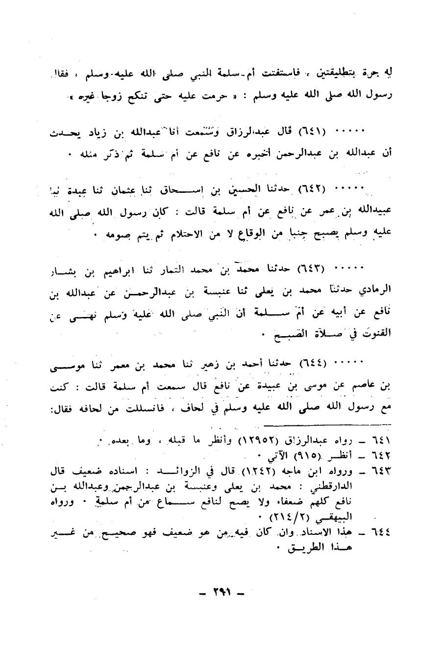 643 - حَدَّثَنَا مُحَمَّدُ بْنُ مُحَمَّدٍ التَّمَّارُ، ثنا إِبْرَاهِيمُ بْنُ بَشَّارٍ الرَّمَادِيُّ، حَدَّثَنَا مُحَمَّدُ بْنُ يَعْلَى، ثنا عَنْبَسَةُ بْنُ عَبْدِ الرَّحْمَنِ، عَنْ عَبْدِ اللهِ بْنِ نَافِعٍ، عَنْ أَبِيهِ، عَنْ أُمِّ سَلَمَةَ، أَنَّ النَّبِيَّ صَلَّى اللهُ عَلَيْهِ وَسَلَّمَ «§نَهَى عَنِ الْقُنُوتِ فِي صَلَاةِ الصُّبْحِ»