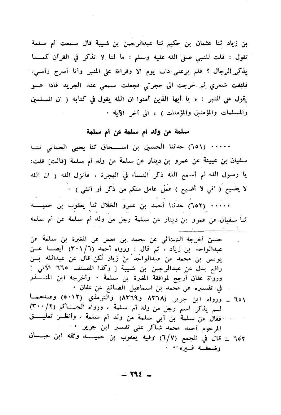 651 - حَدَّثَنَا الْحُسَيْنُ بْنُ إِسْحَاقَ، ثنا يَحْيَى الْحِمَّانِيُّ، ثنا سُفْيَانُ بْنُ عُيَيْنَةَ، عَنْ عَمْرِو بْنِ دِينَارٍ، عَنْ سَلَمَةَ، مِنْ وَلَدِ أُمِّ سَلَمَةَ، عَنْ أُمِّ سَلَمَةَ، قَالَتْ: قُلْتُ: يَا رَسُولَ اللهِ لَمْ أَسْمَعِ اللهَ ذَكَرَ النِّسَاءَ فِي الْهِجْرَةِ، فَأَنْزَلَ اللهُ " {§أَنِّي لَا أُضِيعُ عَمَلَ عَامِلٍ مِنْكُمْ مِنْ ذَكَرٍ أَوْ أُنْثَى} [سورة: آل عمران، آية رقم: 195] "