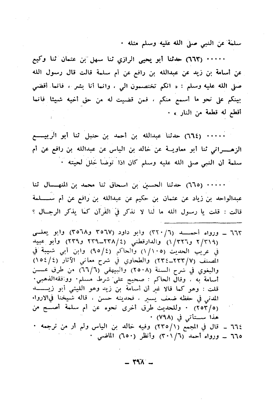 663 - حَدَّثَنَا أَبُو يَحْيَى الرَّازِيُّ، ثنا سَهْلُ بْنُ عُثْمَانَ، ثنا وَكِيعٌ، عَنْ أُسَامَةَ بْنِ زَيْدٍ، عَنْ عَبْدِ اللهِ بْنِ رَافِعٍ، عَنْ أُمِّ سَلَمَةَ، قَالَتْ: قَالَ رَسُولُ اللهِ صَلَّى اللهُ عَلَيْهِ وَسَلَّمَ: «إِنَّكُمْ §تَخْتَصِمُونَ إِلَيَّ، وَإِنَّمَا أَنَا بَشَرٌ، فَإِنَّمَا أَقْضِي بَيْنَكُمْ عَلَى نَحْوِ مَا أَسْمَعُ مِنْكُمْ، فَمَنْ قَضَيْتُ لَهُ مِنْ حَقِّ أَخِيهِ شَيْئًا فَإِنَّمَا أَقْطَعُ لَهُ قِطْعَةً مِنَ النَّارِ»