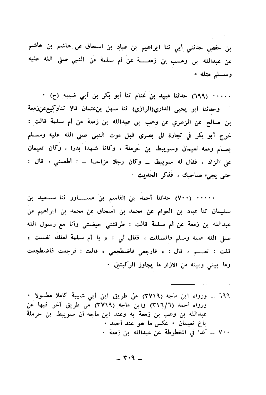 700 - حَدَّثَنَا أَحْمَدُ بْنُ الْقَاسِمِ بْنُ مُسَاوِرٍ، ثنا سَعِيدُ بْنُ سُلَيْمَانَ، ثنا عَبَّادُ بْنُ الْعَوَّامِ، عَنْ مُحَمَّدِ بْنِ إِسْحَاقَ، عَنْ مُحَمَّدِ بْنِ إِبْرَاهِيمَ، عَنْ عَبْدِ اللهِ بْنِ زَمْعَةَ، عَنْ أُمِّ سَلَمَةَ، قَالَتْ: طَرَقَتْنِي حَيْضَتِي وَأَنَا مَعَ رَسُولِ اللهِ صَلَّى اللهُ عَلَيْهِ وَسَلَّمَ فَانْسَلَلْتُ، فَقَالَ لِي: «يَا أُمَّ سَلَمَةَ §لَعَلَّكِ نُفِسْتِ» ، قُلْتُ: نَعَمْ، قَالَ: «فَارْجِعِي فَاضْطَجِعِي» ، قَالَتْ: فَرَجَعْتُ فَاضْطَجَعْتُ، وَمَا بَيْنِي وَبَيْنَهُ مِنَ الْإِزَارِ مَا يُجَاوِزُ الرُّكْبَتَيْنِ