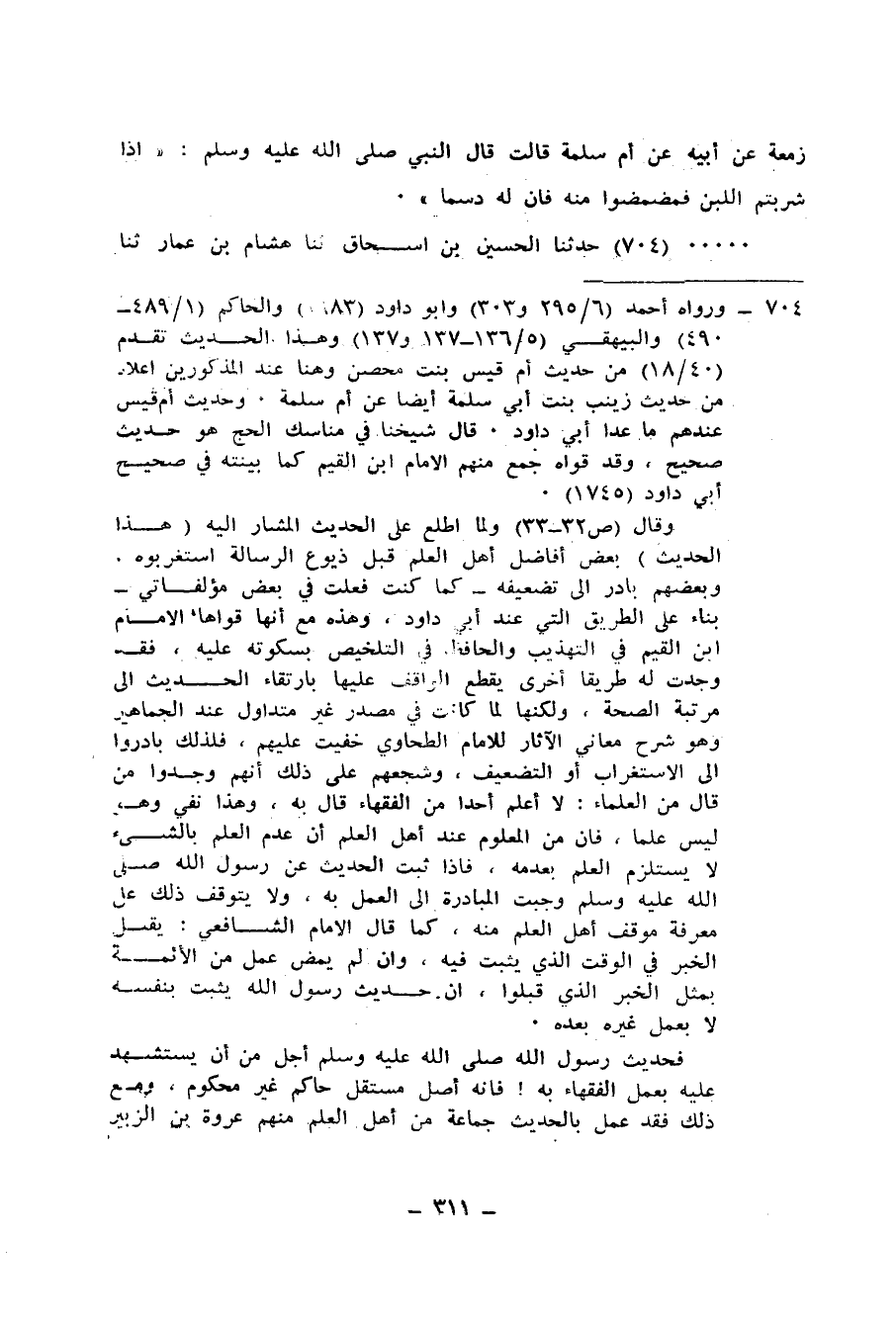 704 - حَدَّثَنَا الْحُسَيْنُ بْنُ إِسْحَاقَ، ثنا هِشَامُ بْنُ عَمَّارٍ، ثنا الْخَلِيلُ بْنُ مُوسَى، ثنا مُحَمَّدُ بْنُ إِسْحَاقَ، عَنْ أَبِي عُبَيْدَةَ بْنِ عَبْدِ اللهِ بْنِ زَمْعَةَ، عَنْ أَبِيهِ، عَنْ أُمِّ سَلَمَةَ، قَالَتْ: لَمَّا كَانَ مَسَاءُ يَوْمِ النَّحْرِ رَأَى رَسُولُ اللهِ صَلَّى اللهُ عَلَيْهِ وَسَلَّمَ وَهْبَ بْنَ زَمْعَةَ، وَرَجُلًا مِنْ آلِ أَبِي أُمَيَّةَ، وَهُمَا مُتَقَمِّصَانِ، فَقَالَ النَّبِيُّ صَلَّى اللهُ عَلَيْهِ وَسَلَّمَ لِوَهْبٍ: «أَفَضْتَ يَا أَبَا عَبْدِ اللهِ؟» ، قَالَ: لَا، قَالَ: «انْزِعْ قَمِيصَكَ» ، قَالَ وَهْبٌ: لِمَ ذَاكَ يَا رَسُولَ اللهِ؟، قَالَ: «إِنَّ §هَذَا يَوْمٌ أُرَخِّصُ لَكُمْ فِيهِ إِذَا رَمَيْتُمْ جَمْرَةَ الْعَقَبَةِ، أَنْ تُحِلُّوا مِنْ كُلِّ شَيْءٍ حُرِّمَ عَلَيْكُمْ مِنْ شَأْنِ الْحَجِّ إِلَّا النِّسَاءَ، فَإِذَا أَمْسَى أَحَدُكُمْ، وَلَمْ يُفِضْ كَانَ كَهَيْأَتِهِ حَرَامًا حَتَّى يُفِيضَ»