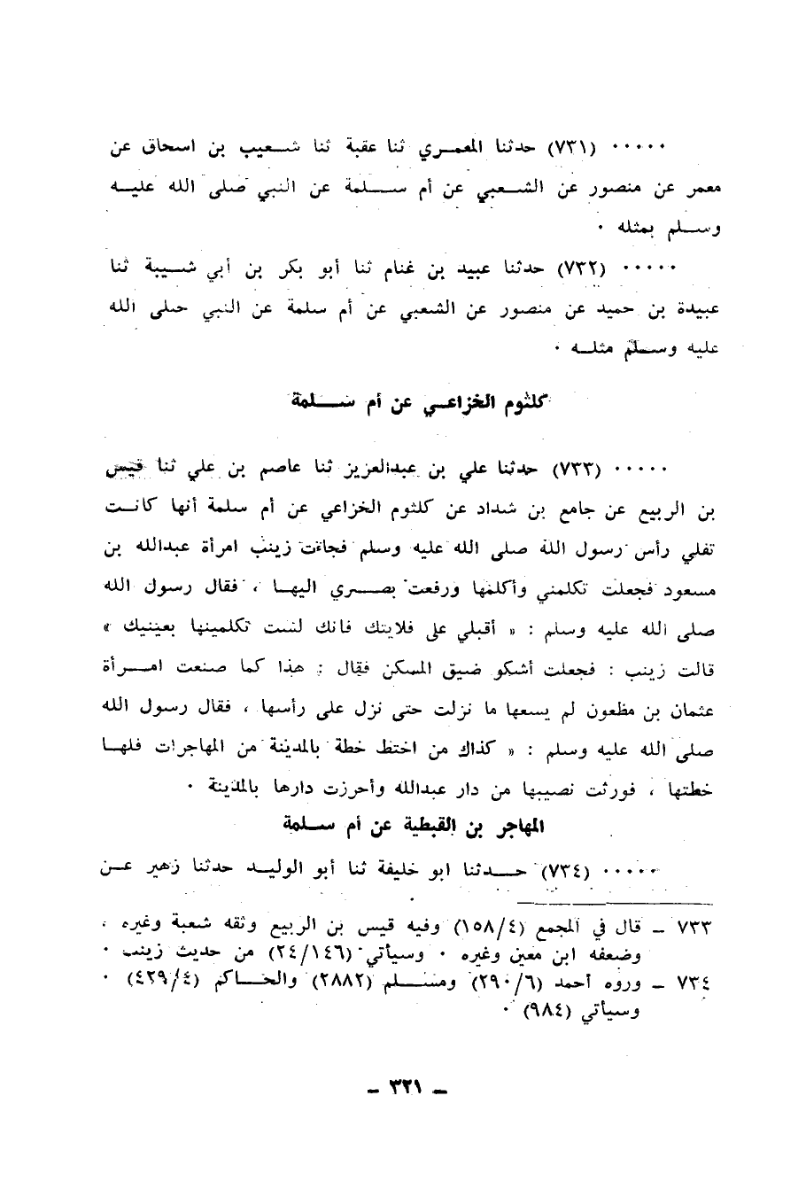 733 - حَدَّثَنَا عَلِيُّ بْنُ عَبْدِ الْعَزِيزِ، ثنا عَاصِمُ بْنُ عَلِيٍّ ثنا قَيْسُ بْنُ الرَّبِيعِ، عَنْ جَامِعِ بْنِ شَدَّادٍ، عَنْ كُلْثُومٍ الْخُزَاعِيِّ، عَنْ أُمِّ سَلَمَةَ، أَنَّهَا كَانَتْ تُفَلِّي رَأْسَ رَسُولِ اللهِ صَلَّى اللهُ عَلَيْهِ وَسَلَّمَ فَجَاءَتْ زَيْنَبُ امْرَأَةُ عَبْدِ اللهِ بْنُ مَسْعُودٍ فَجَعَلَتْ تُكَلِّمُنِي وَأُكَلِّمُهَا وَرَفَعْتُ بَصَرِي إِلَيْهَا، فَقَالَ رَسُولُ اللهِ صَلَّى اللهُ عَلَيْهِ وَسَلَّمَ: «§أَقْبِلِي عَلَى فِلَايَتِكِ، فَإِنَّكِ لَسْتِ تُكَلِّمِينَهَا بِعَيْنَيْكِ» ، قَالَتْ زَيْنَبُ: فَجَعَلْتُ أَشْكُو ضِيقَ الْمَسْكَنِ، فَقَالَ: هَذَا كَمَا صَنَعَتِ امْرَأَةُ عُثْمَانَ بْنِ مَظْعُونٍ، لَمْ يَسَعُهَا مَا نَزَلَتْ حَتَّى نَزَلَ عَلَى رَأْسِهَا، فَقَالَ رَسُولُ اللهِ صَلَّى اللهُ عَلَيْهِ وَسَلَّمَ: «كَذَاكَ مَنِ اخْتَطَّ خُطَّةً بِالْمَدِينَةِ مِنَ الْمُهَاجِرَاتِ، فَلَهَا خِطَّتُهَا، فَوَرِثَتْ نَصِيبَهَا مِنْ دَارِ عَبْدِ اللهِ، وَأَحْرَزَتْ دَارَهَا بِالْمَدِينَةِ»