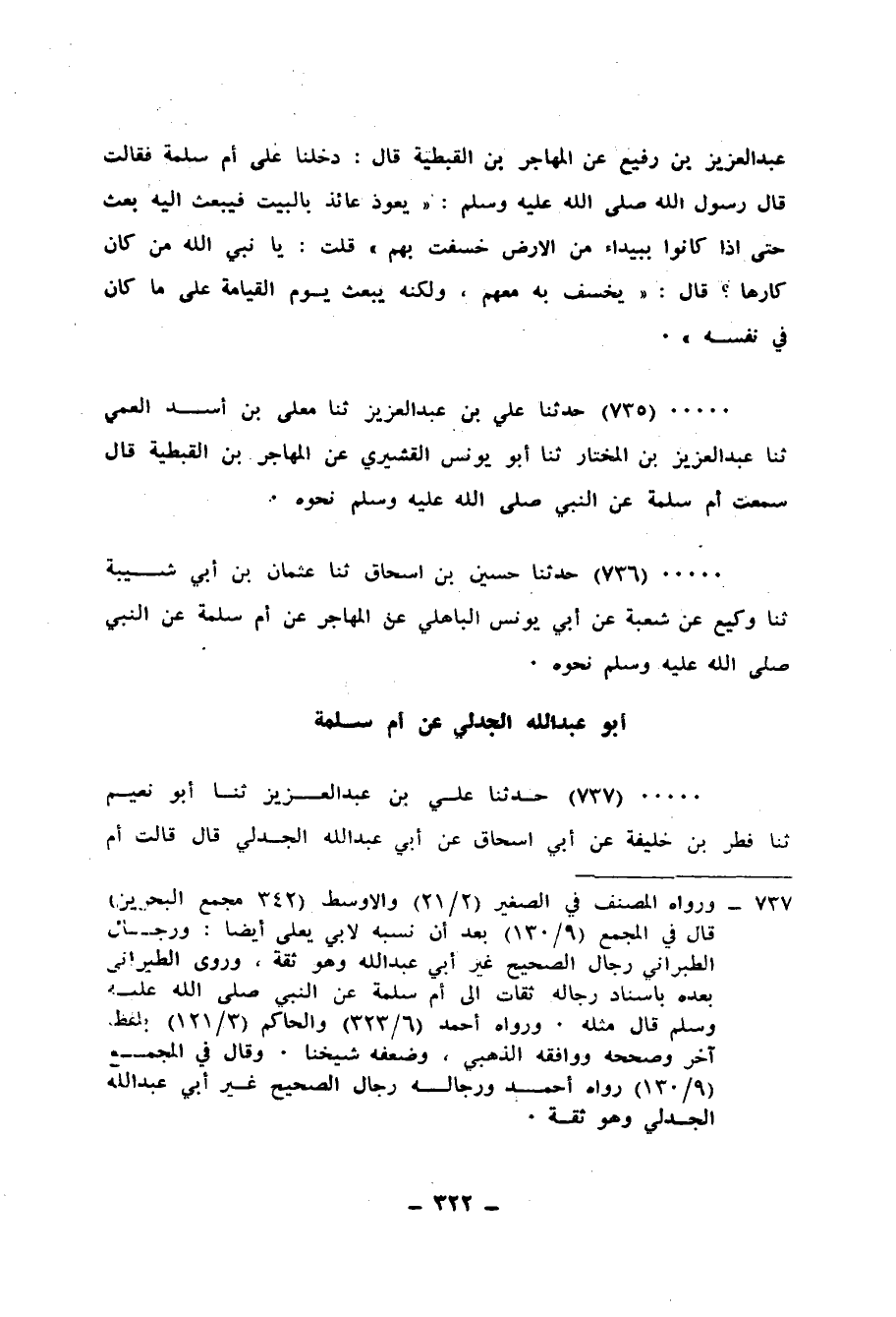 737 - حَدَّثَنَا عَلِيُّ بْنُ عَبْدِ الْعَزِيزِ، ثنا أَبُو نُعَيْمٍ، ثنا فِطْرُ بْنُ خَلِيفَةَ، عَنْ أَبِي إِسْحَاقَ، عَنْ أَبِي عَبْدِ اللهِ الْجَدَلِيِّ، قَالَ: قَالَتْ أُمُّ سَلَمَةَ: يَا أَبَا عَبْدِ اللهِ أَيُسَبُّ رَسُولُ اللهِ صَلَّى اللهُ عَلَيْهِ وَسَلَّمَ فِيكُمْ؟ قُلْتُ: وَمَنْ يَسُبُّ رَسُولَ اللهِ صَلَّى اللهُ عَلَيْهِ وَسَلَّمَ؟ قَالَتْ: «§أَلَيْسَ يُسَبُّ عَلِيٌّ وَمَنْ يُحِبُّهُ، وَقَدْ كَانَ رَسُولُ اللهِ صَلَّى اللهُ عَلَيْهِ وَسَلَّمَ يُحِبُّهُ» -[323]-.