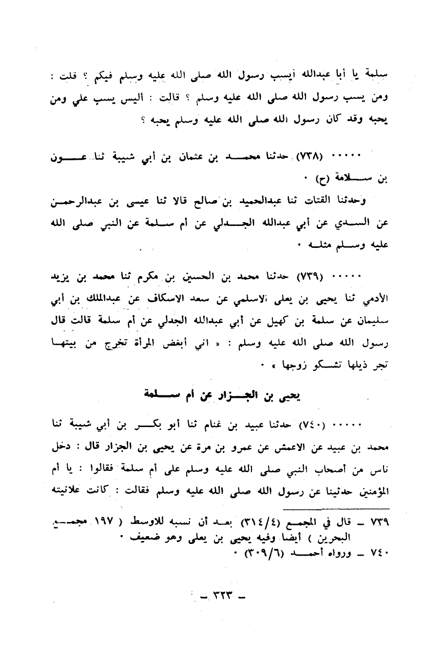 739 - حَدَّثَنَا مُحَمَّدُ بْنُ الْحُسَيْنِ بْنِ مُكْرَمٍ، ثنا مُحَمَّدُ بْنُ يَزِيدَ الْأَدْمِيُّ، ثنا يَحْيَى بْنُ يَعْلَى الْأَسْلَمِيُّ، عَنْ سَعْدٍ الْإِسْكَافِ، عَنْ عَبْدِ الْمَلِكِ بْنِ أَبِي سُلَيْمَانَ، عَنْ سَلَمَةَ بْنِ كُهَيْلٍ، عَنْ أَبِي عَبْدِ اللهِ الْجَدَلِيِّ، عَنْ أُمِّ سَلَمَةَ، قَالَتْ: قَالَ رَسُولُ اللهِ صَلَّى اللهُ عَلَيْهِ وَسَلَّمَ: «إِنِّي §أُبْغِضُ الْمَرْأَةَ تَخْرُجُ مِنْ بَيْتِهَا تَجُرُّ ذَيْلَهَا تَشْكُو زَوْجَهَا»