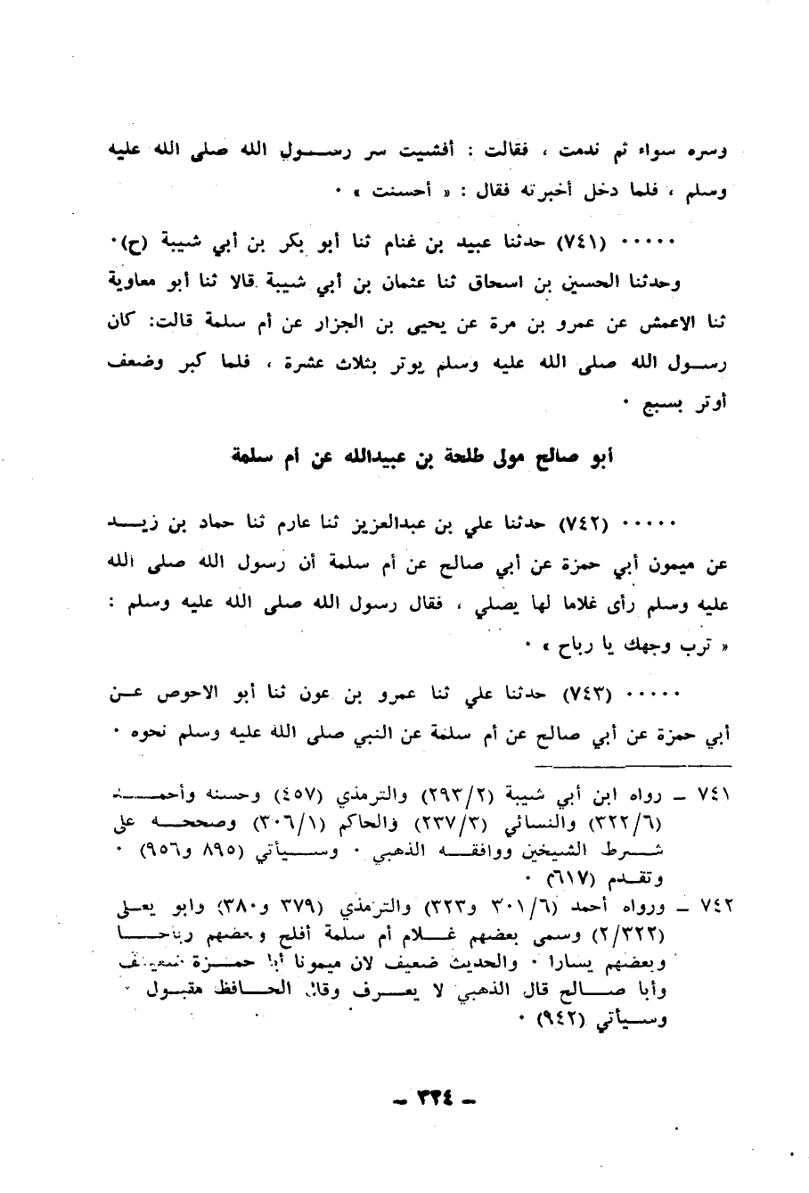 743 - حَدَّثَنَا عَلِيٌّ، ثنا عَمْرُو بْنُ عَوْنٍ، ثنا أَبُو الْأَحْوَصِ، عَنْ أَبِي حَمْزَةَ، عَنْ أَبِي صَالِحٍ، عَنْ أُمِّ سَلَمَةَ، عَنِ النَّبِيِّ صَلَّى اللهُ عَلَيْهِ وَسَلَّمَ نَحْوَهُ -[325]-.