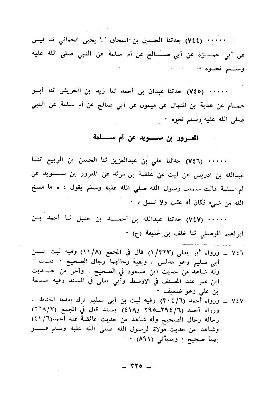 747 - حَدَّثَنَا عَبْدُ اللهِ بْنُ أَحْمَدَ بْنِ حَنْبَلٍ، ثنا أَحْمَدُ بْنُ إِبْرَاهِيمَ الْمَوْصِلِيُّ، ثنا خَلَفُ بْنُ خَلِيفَةَ، ح وَحَدَّثَنَا حُسَيْنُ بْنُ إِسْحَاقَ، ثنا أَبُو الرَّبِيعِ الزَّهْرَانِيُّ، ثنا خَلَفُ بْنُ خَلِيفَةَ، وَحَدَّثَنَا مُحَمَّدُ بْنُ عَلِيٍّ الصَّائِغُ، ثنا سَعِيدُ بْنُ مَنْصُورٍ، ثنا خَلَفُ بْنُ خَلِيفَةَ، عَنْ لَيْثٍ، عَنْ عَلْقَمَةَ بْنِ مَرْثَدٍ، عَنِ الْمَعْرُورِ بْنِ سُوَيْدٍ، قَالَ: سَمِعْتُ أُمَّ سَلَمَةَ، تَقُولُ: سَمِعْتُ رَسُولَ اللهِ صَلَّى اللهُ عَلَيْهِ وَسَلَّمَ يَقُولُ: «§إِذَا ظَهَرَتِ الْمَعَاصِي فِي أُمَّتِي عَمَّهُمُ اللهُ بِعَذَابٍ» ، قُلْتُ: يَا رَسُولَ اللهِ أَمَا فِي النَّاسِ يَوْمَئِذٍ نَاسٌ صَالِحُونَ، قَالَ: «بَلَى» ، قُلْتُ: فَكَيْفَ يَصْنَعُ أُولَئِكَ؟، قَالَ: «يُصِيبُهُمْ مَا أَصَابَ النَّاسَ ثُمَّ يَصِيرُونَ إِلَى مَغْفِرَةٍ مِنَ اللهِ وَرِضْوَانٍ» ، «لَفْظُ حَدِيثِ أَبِي الرَّبِيعِ»