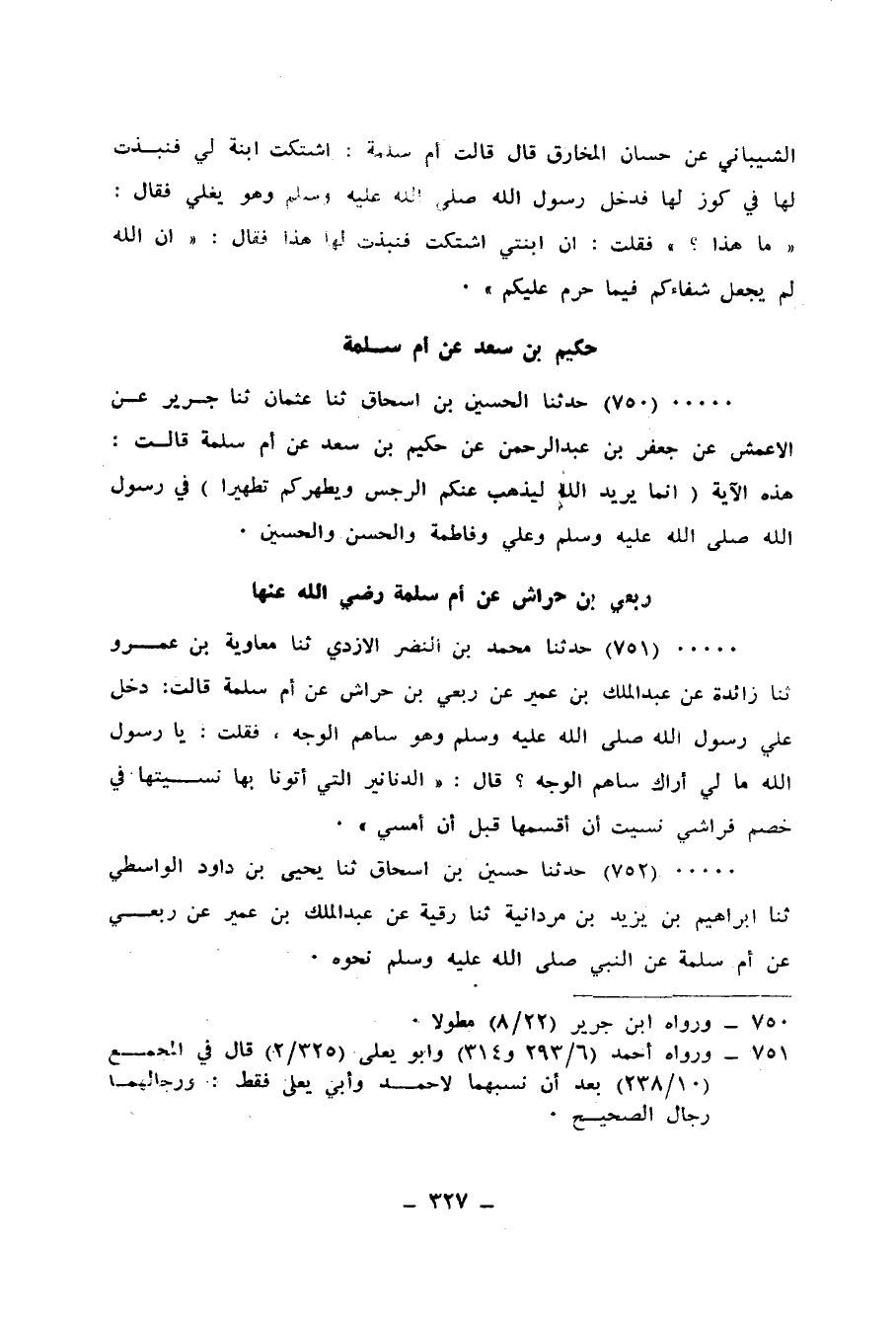 750 - حَدَّثَنَا الْحُسَيْنُ بْنُ إِسْحَاقَ، ثنا عُثْمَانُ، ثنا جَرِيرٌ، عَنِ الْأَعْمَشِ، عَنْ جَعْفَرِ بْنِ عَبْدِ الرَّحْمَنِ، عَنْ حَكِيمِ بْنِ سَعْدٍ، عَنْ أُمِّ سَلَمَةَ، قَالَتْ هَذِهِ الْآيَةُ: {§إِنَّمَا يُرِيدُ اللهُ لِيُذْهِبَ عَنْكُمُ الرِّجْسَ أَهْلَ الْبَيْتِ وَيُطَهِّرَكُمْ تَطْهِيرًا} [الأحزاب: 33] فِي رَسُولِ اللهِ صَلَّى اللهُ عَلَيْهِ وَسَلَّمَ وَعَلِيٍّ وَفَاطِمَةَ وَالْحَسَنِ وَالْحُسَيْنِ