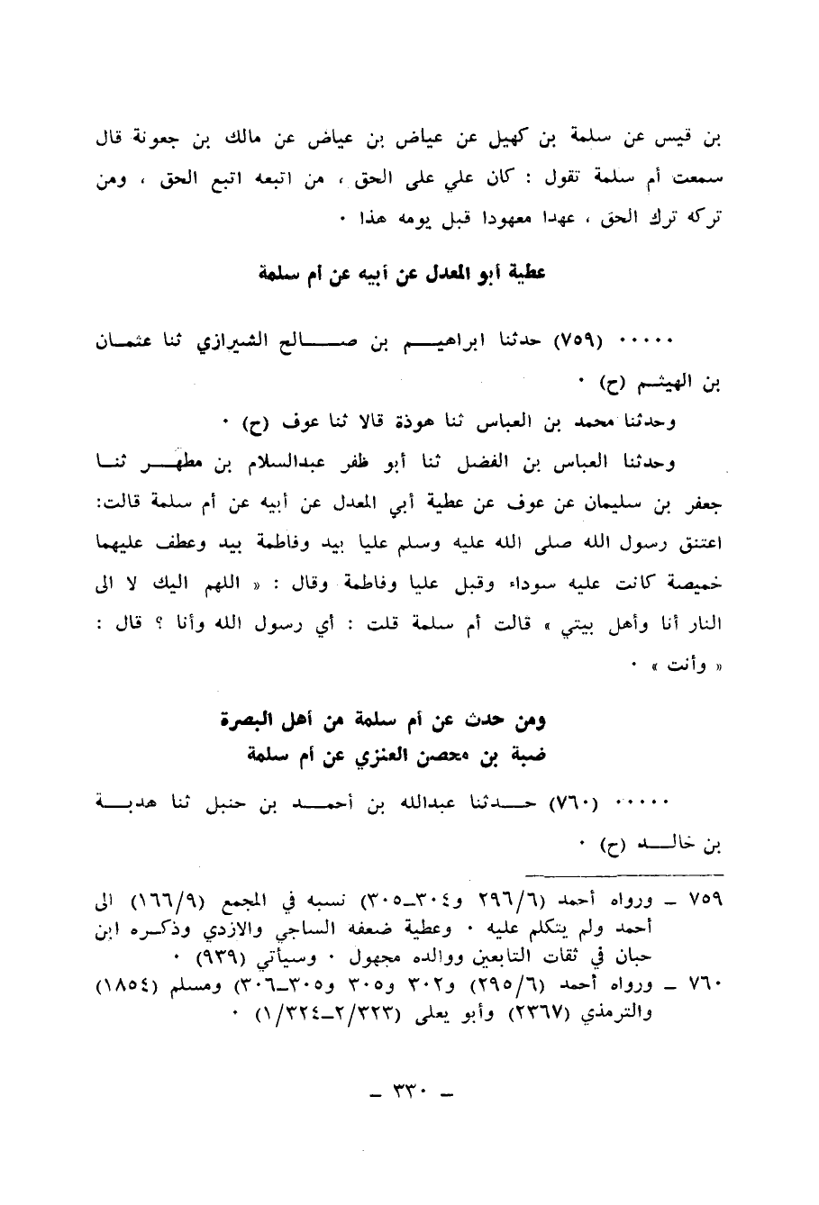 759 - حَدَّثَنَا إِبْرَاهِيمُ بْنُ صَالِحٍ الشِّيرَازِيُّ، ثنا عُثْمَانُ بْنُ الْهَيْثَمِ، ح وَحَدَّثَنَا مُحَمَّدُ بْنُ الْعَبَّاسِ، ثنا هَوْذَةُ، قَالَا: ثنا عَوْفٌ، ح وَحَدَّثَنَا الْعَبَّاسُ بْنُ الْفَضْلِ، ثنا أَبُو ظَفَرَ عَبْدُ السَّلَامِ بْنُ مُطَهَّرٍ، ثنا جَعْفَرُ بْنُ سُلَيْمَانَ، عَنْ عَوْفٍ، عَنْ عَطِيَّةَ أَبِي الْمُعَذِّلِ، عَنْ أَبِيهِ، عَنْ أُمِّ سَلَمَةَ، قَالَتْ: اعْتَنَقَ رَسُولُ اللهِ صَلَّى اللهُ عَلَيْهِ وَسَلَّمَ عَلِيًّا بِيَدٍ وَفَاطِمَةَ بِيَدٍ، وَعَطَفَ عَلَيْهِمَا خَمِيصَةً كَانَتْ عَلَيْهِ سَوْدَاءَ، وَقَبَّلَ عَلِيًّا وَفَاطِمَةَ، وَقَالَ: «§اللهُمَّ إِلَيْكَ لَا إِلَى النَّارِ أَنَا وَأَهْلُ بَيْتِي» ، قَالَتْ أُمُّ سَلَمَةَ، قُلْتُ: أَيْ رَسُولُ اللهِ وَأَنَا؟ قَالَ: «وَأَنْتِ»