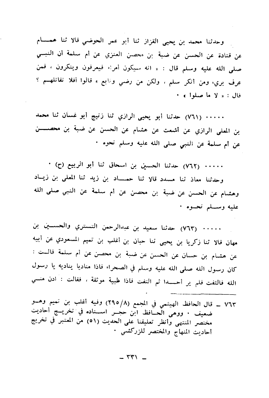 763 - حَدَّثَنَا سَعِيدُ بْنُ عَبْدِ الرَّحْمَنِ التُّسْتَرِيُّ، وَالْحُسَيْنُ بْنُ مُهَّانَ، قَالَا: ثنا زَكَرِيَّا بْنُ يَحْيَى، ثنا حِبَّانُ بْنُ أَغْلَبَ بْنِ تَمِيمٍ الْمَسْعُودِيُّ، عَنْ أَبِيهِ، عَنْ هِشَامِ بْنِ حَسَّانٍ، عَنِ الْحَسَنِ، عَنْ ضَبَّةَ بْنِ مِحْصَنٍ، عَنْ أُمِّ سَلَمَةَ، قَالَتْ: كَانَ رَسُولُ اللهِ صَلَّى اللهُ عَلَيْهِ وَسَلَّمَ فِي الصَّحْرَاءِ فَإِذَا مُنَادٍ يُنَادِيهِ يَا رَسُولَ اللهِ فَالْتَفَتَ، فَلَمْ يَرَ أَحَدًا، ثُمَّ الْتَفَتَ فَإِذَا ظَبْيَةٌ مُوَثَّقَةٌ، فَقَالَتْ: ادْنُ مِنِّي يَا رَسُولَ اللهِ فَدَنَا مِنْهَا، فَقَالَ: «حَاجَتَكِ؟» قَالَتْ: إِنَّ لِي خَشَفَيْنِ فِي ذَلِكَ الْجَبَلِ فَحُلَّنِي حَتَّى أَذْهَبَ، فَأُرْضِعَهُمَا، ثُمَّ أَرْجِعُ إِلَيْكَ، قَالَ: «وَتَفْعَلِينَ؟» ، قَالَتْ: عَذَّبَنِي اللهُ بِعَذَابِ الْعِشَارِ إِنْ لَمْ أَفْعَلْ، فَأَطْلَقَهَا فَذَهَبَتْ، فَأَرْضَعَتْ خَشَفَيْهَا، ثُمَّ رَجَعَتْ، فَأَوْثَقَهَا وَانْتَبَهَ الْأَعْرَابِيُّ، فَقَالَ: لَكَ حَاجَةٌ يَا رَسُولَ اللهِ، قَالَ: «نَعَمْ §تُطْلِقُ هَذِهِ» ، فَأَطْلَقَهَا فَخَرَجَتْ تَعْدُو، وَهِيَ تَقُولُ: أَشْهَدُ أَنْ لَا إِلَهَ إِلَّا اللهُ وَأَنَّكَ رَسُولُ اللهِ "