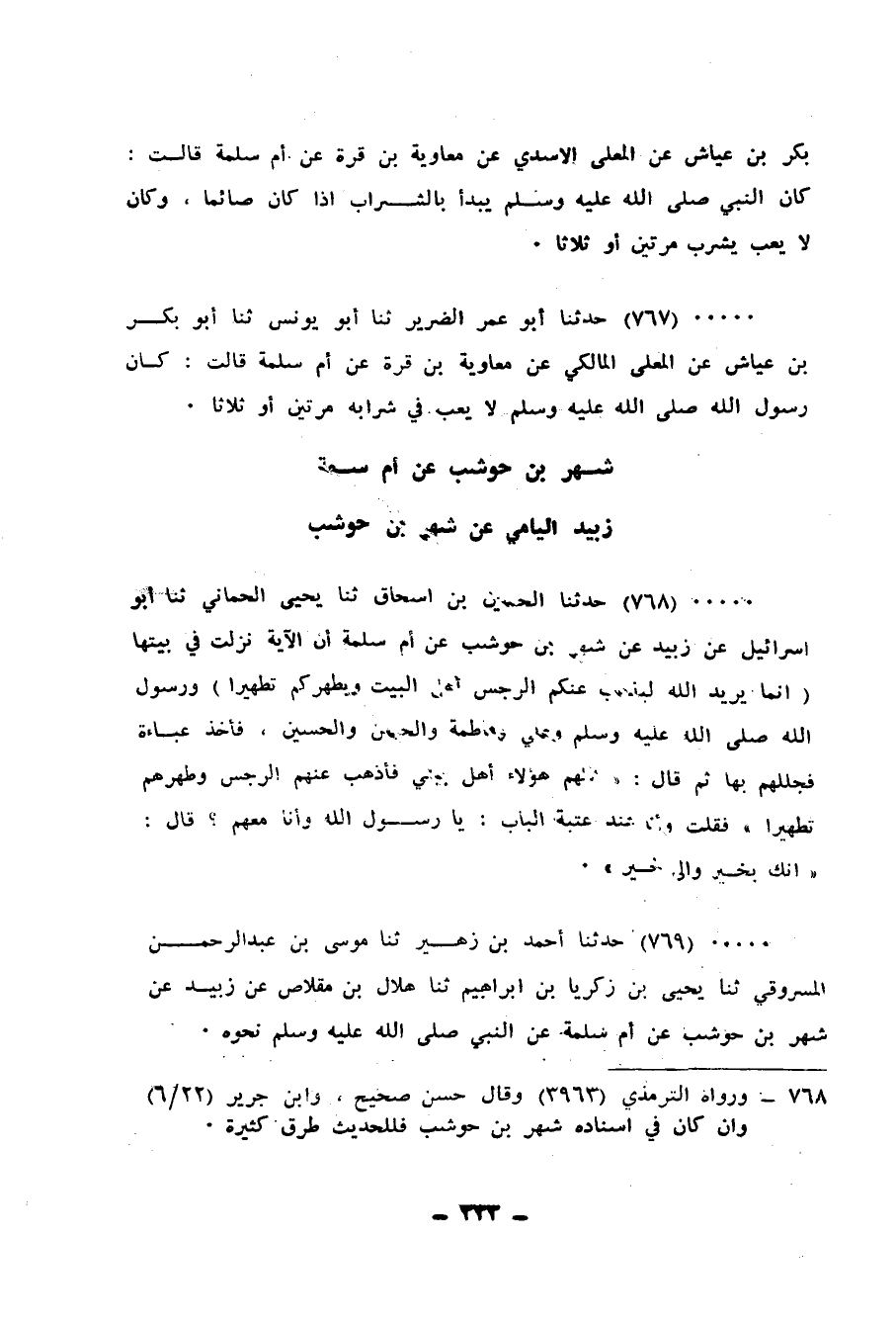 769 - حَدَّثَنَا أَحْمَدُ بْنُ زُهَيْرٍ، ثنا مُوسَى بْنُ عَبْدِ الرَّحْمَنِ الْمَسْرُوقِيُّ، ثنا يَحْيَى بْنُ زَكَرِيَّا بْنِ إِبْرَاهِيمَ، ثنا هِلَالُ بْنُ مِقْلَاصٍ، عَنْ زُبَيْدٍ، عَنْ شَهْرِ بْنِ حَوْشَبٍ، عَنْ أُمِّ سَلَمَةَ، عَنِ النَّبِيِّ صَلَّى اللهُ عَلَيْهِ وَسَلَّمَ نَحْوَهُ -[334]-.