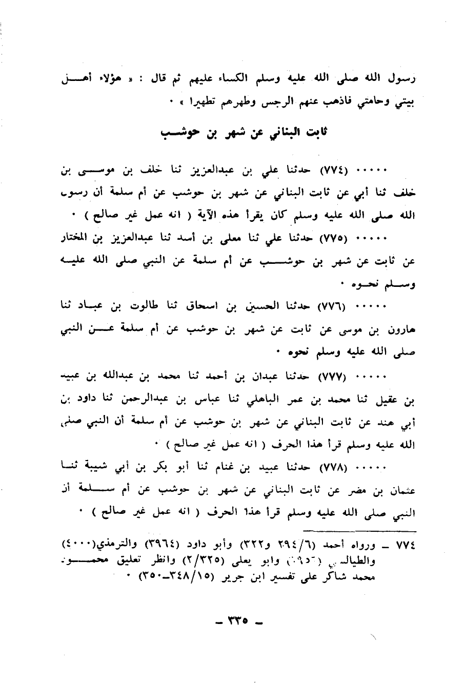 776 - حَدَّثَنَا الْحُسَيْنُ بْنُ إِسْحَاقَ، ثنا طَالُوتُ بْنُ عَبَّادٍ، ثنا هَارُونُ بْنُ مُوسَى، عَنْ ثَابِتٍ، عَنْ شَهْرِ بْنِ حَوْشَبٍ، عَنْ أُمِّ سَلَمَةَ، عَنِ النَّبِيِّ صَلَّى اللهُ عَلَيْهِ وَسَلَّمَ نَحْوَهُ