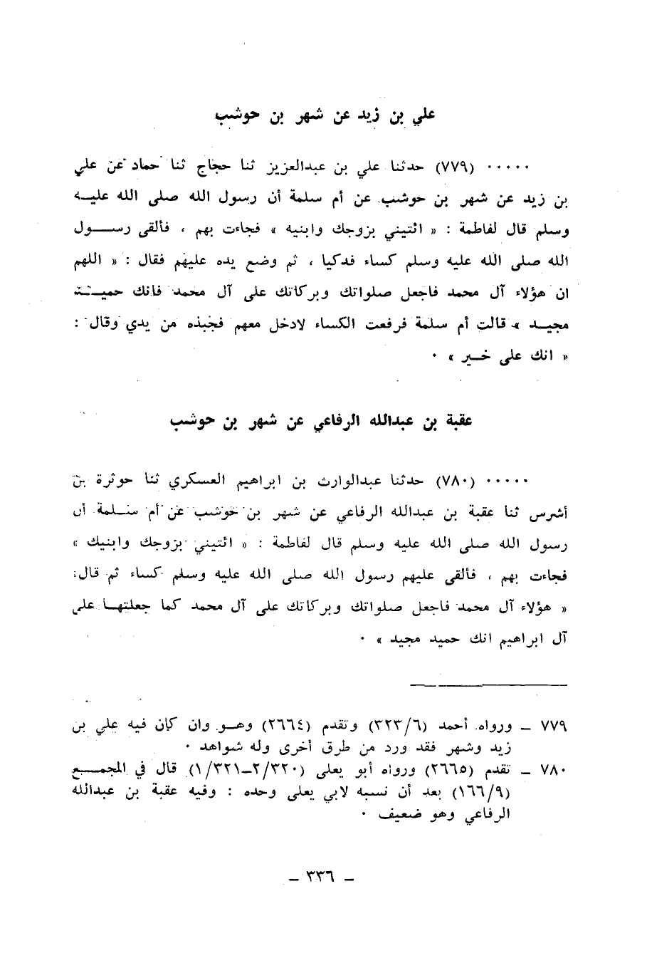 780 - حَدَّثَنَا عَبْدُ الْوَارِثِ بْنُ إِبْرَاهِيمَ الْعَسْكَرِيُّ، ثنا حَوْثَرَةُ بْنُ أَشْرَسَ، ثنا عُقْبَةُ بْنُ عَبْدِ اللهِ الرِّفَاعِيُّ، عَنْ شَهْرِ بْنِ حَوْشَبٍ، عَنْ أُمِّ سَلَمَةَ، أَنَّ رَسُولَ اللهِ صَلَّى اللهُ عَلَيْهِ وَسَلَّمَ قَالَ لِفَاطِمَةَ: «ائْتِنِي بِزَوْجِكِ وَابْنَيْكِ» ، فَجَاءَتْ بِهِمْ، فَأَلْقَى عَلَيْهِمْ رَسُولُ اللهِ صَلَّى اللهُ عَلَيْهِ وَسَلَّمَ كِسَاءً، ثُمَّ قَالَ: «§هَؤُلَاءِ آلُ مُحَمَّدٍ، فَاجْعَلْ صَلَوَاتِكَ وَبَرَكَاتِكَ عَلَى آلِ مُحَمَّدٍ، كَمَا جَعَلْتَهَا عَلَى آلِ إِبْرَاهِيمَ إِنَّكَ حَمِيدٌ مَجِيدٌ»