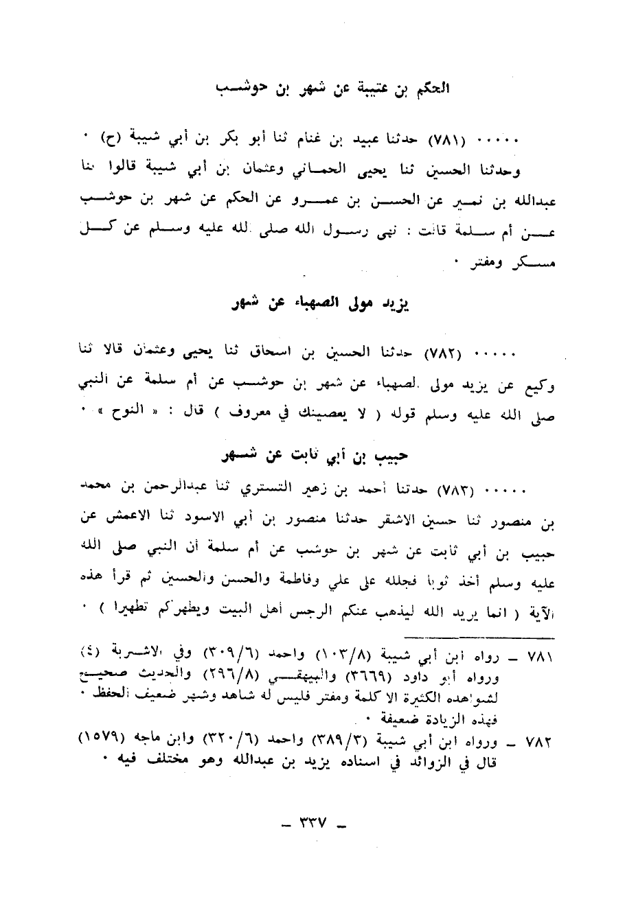 781 - حَدَّثَنَا عُبَيْدُ بْنُ غَنَّامٍ، ثنا أَبُو بَكْرِ بْنُ أَبِي شَيْبَةَ، ح وَحَدَّثَنَا الْحُسَيْنُ، ثنا يَحْيَى الْحِمَّانِيُّ، وَعُثْمَانُ بْنُ أَبِي شَيْبَةَ، قَالُوا: ثنا عَبْدُ اللهِ بْنُ نُمَيْرٍ، عَنِ الْحَسَنِ بْنِ عَمْرٍو، عَنِ الْحَكَمِ، عَنْ شَهْرِ بْنِ حَوْشَبٍ، عَنْ أُمِّ سَلَمَةَ، قَالَتْ: «§نَهَى رَسُولُ اللهِ صَلَّى اللهُ عَلَيْهِ وَسَلَّمَ عَنْ كُلِّ مُسْكِرٍ وَمُفَتِّرٍ»