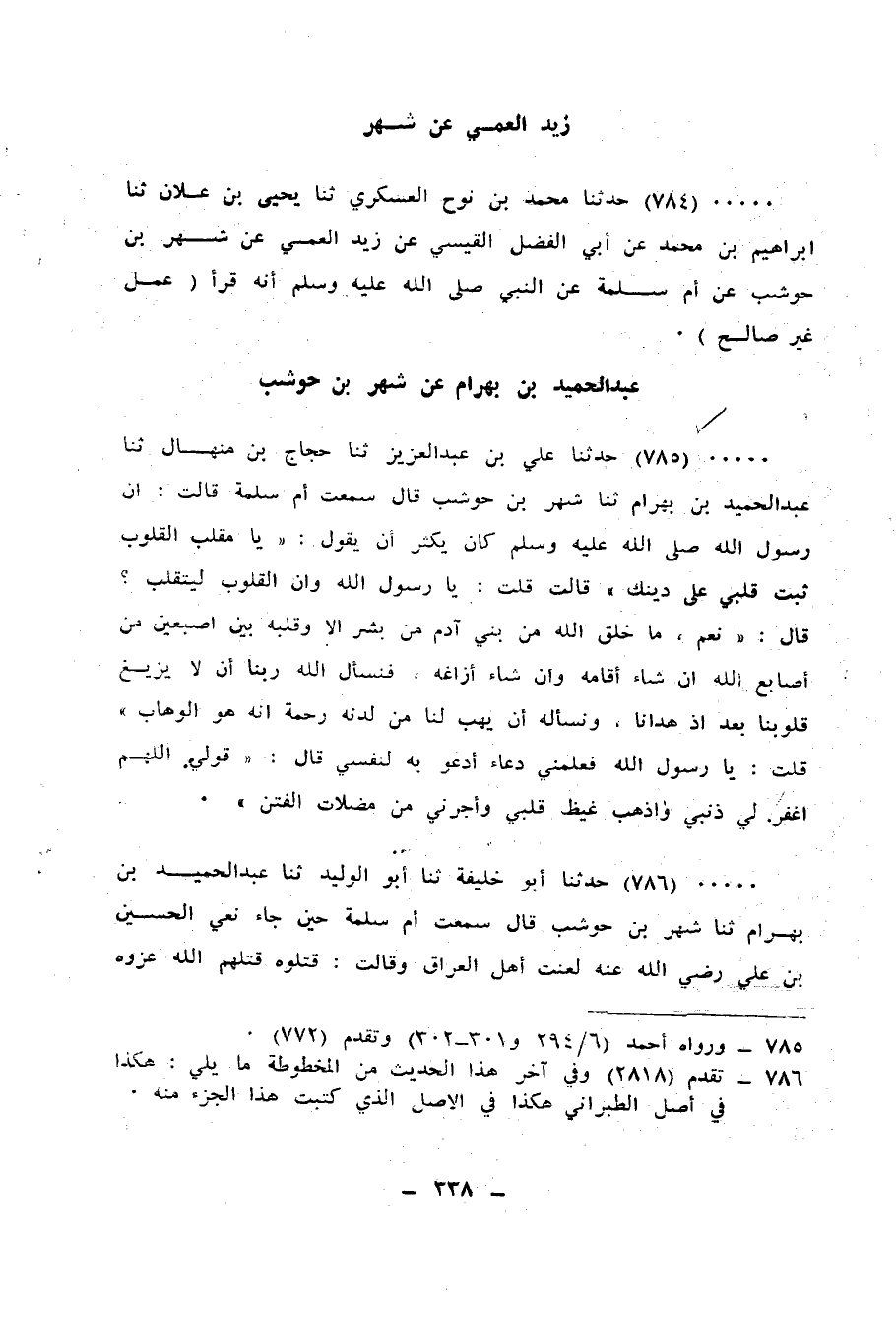 785 - حَدَّثَنَا عَلِيُّ بْنُ عَبْدِ الْعَزِيزِ، ثنا حَجَّاجُ بْنُ مِنْهَالٍ، ثنا عَبْدُ الْحَمِيدِ بْنُ بَهْرَامَ، ثنا شَهْرُ بْنُ حَوْشَبٍ، قَالَ: سَمِعْتُ أُمَّ سَلَمَةَ، قَالَتْ: إِنَّ رَسُولَ اللهِ صَلَّى اللهُ عَلَيْهِ وَسَلَّمَ كَانَ يُكْثِرُ أَنْ يَقُولَ: «يَا مُقَلِّبَ الْقُلُوبِ ثَبِّتْ قَلْبِي عَلَى دِينِكَ» ، قَالَتْ: قُلْتُ: يَا رَسُولَ اللهِ وَإِنَّ الْقُلُوبَ لَتَتَقَلَّبُ، قَالَ: «نَعَمْ §مَا خَلَقَ اللهُ مِنْ بَنِي آدَمَ مِنْ بَشَرٍ إِلَّا وَقَلْبُهُ بَيْنَ أُصْبُعَيْنِ مِنْ أَصَابِعِ اللهِ إِنْ شَاءَ أَقَامَهُ وَإِنْ شَاءَ أَزَاغَهُ، فَنَسْأَلُ اللهَ رَبَّنَا أَنْ لَا يُزِيغَ قُلُوبَنَا بَعْدَ إِذْ هَدَانَا، وَنَسْأَلُهُ أَنْ يَهَبَ لَنَا مِنْ لَدُنْهُ رَحْمَةً إِنَّهُ هُوَ الْوَهَّابُ» ، قُلْتُ: يَا رَسُولَ اللهِ فَعَلِّمْنِي دُعَاءً أَدْعُو بِهِ لِنَفْسِي، قَالَ: «قُولِي اللهُمَّ اغْفِرْ لِي ذَنْبِي وَأَذْهِبْ غَيْظَ قَلْبِي وَأَجِرْنِي مِنْ مُضِلَّاتِ الْفِتَنِ»