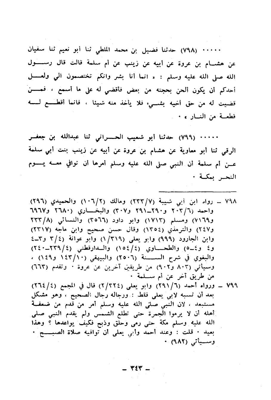 798 - حَدَّثَنَا فُضَيْلُ بْنُ مُحَمَّدٍ الْمَلْطِيُّ، ثنا أَبُو نُعَيْمٍ، ثنا سُفْيَانُ، عَنْ هِشَامِ بْنِ عُرْوَةَ، عَنْ أَبِيهِ، عَنْ زَيْنَبَ، عَنْ أُمِّ سَلَمَةَ، قَالَتْ: قَالَ رَسُولُ اللهِ صَلَّى اللهُ عَلَيْهِ وَسَلَّمَ: «إِنَّمَا §أَنَا بَشَرٌ وَإِنَّكُمْ تَخْتَصِمُونَ إِلَيَّ، وَلَعَلَّ أَحَدَكُمْ أَنْ يَكُونَ أَلْحَنَ بِحُجَّتِهِ مِنْ بَعْضٍ، فَأَقْضِي لَهُ عَلَى مَا أَسْمَعُ، فَمَنْ قَضَيْتُ لَهُ مِنْ حَقِّ أَخِيهِ بِشَيْءٍ فَلَا يَأْخُذْ مِنْهُ شَيْئًا، فَإِنَّمَا أَقْطَعُ لَهُ قِطْعَةً مِنَ النَّارِ»