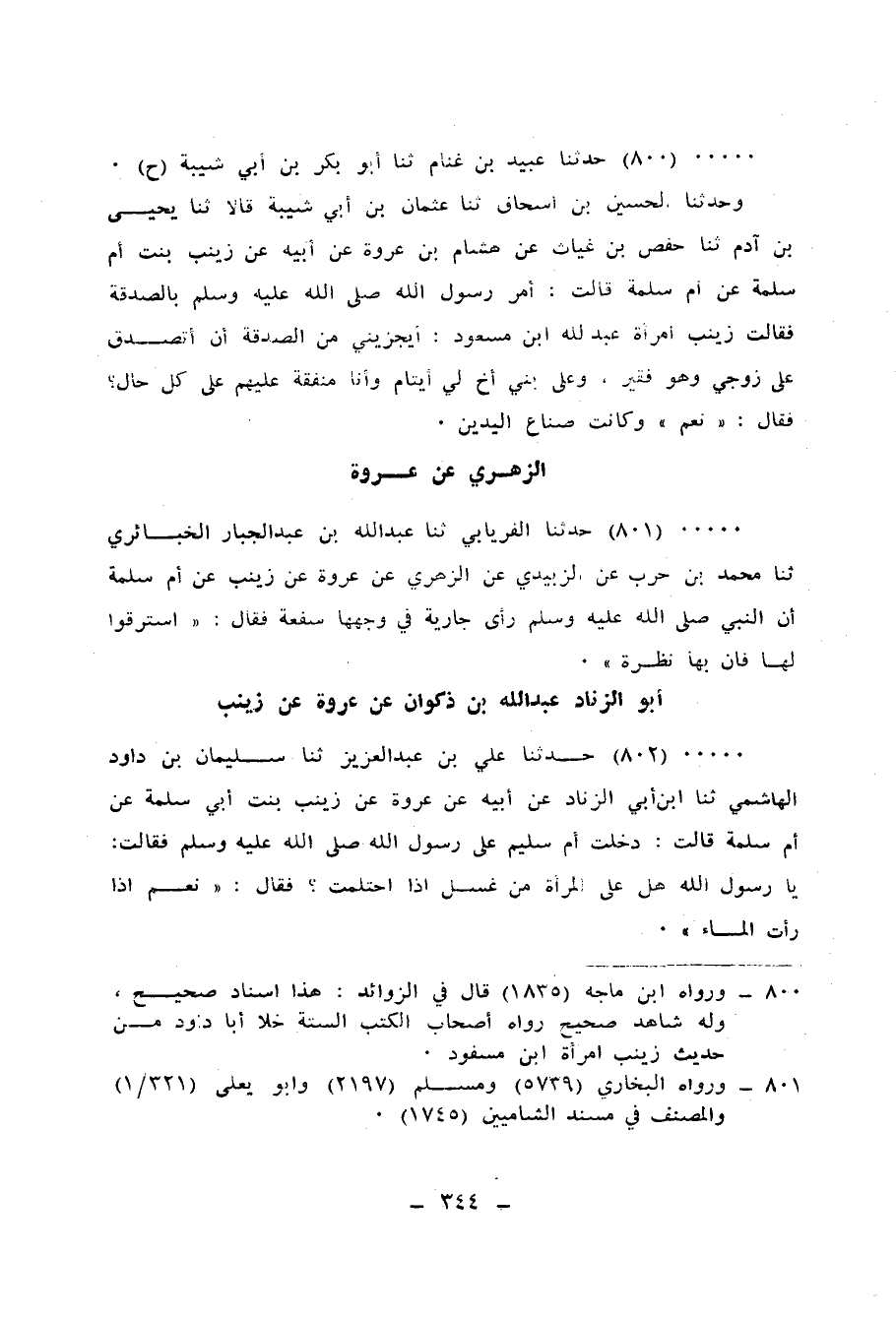 800 - حَدَّثَنَا عُبَيْدُ بْنُ غَنَّامٍ، ثنا أَبُو بَكْرِ بْنُ أَبِي شَيْبَةَ، وَحَدَّثَنَا الْحُسَيْنُ بْنُ إِسْحَاقَ، ثنا عُثْمَانُ بْنُ أَبِي شَيْبَةَ، قَالَا: ثنا يَحْيَى بْنُ آدَمَ، ثنا حَفْصُ بْنُ غِيَاثٍ، عَنْ هِشَامِ بْنِ عُرْوَةَ، عَنْ أَبِيهِ، عَنْ زَيْنَبَ بِنْتِ أُمِّ سَلَمَةَ، عَنْ أُمِّ سَلَمَةَ، قَالَتْ: §أَمَرَ رَسُولُ اللهِ صَلَّى اللهُ عَلَيْهِ وَسَلَّمَ بِالصَّدَقَةِ، فَقَالَتْ زَيْنَبُ امْرَأَةُ عَبْدِ اللهِ بْنِ مَسْعُودٍ: أَيُجْزِئُنِي مِنَ الصَّدَقَةِ أَنْ أَتَصَدَّقَ عَلَى زَوْجِي وَهُوَ فَقِيرٌ، وَعَلَى بَنِي أَخٍ لِي أَيْتَامٍ وَأَنَا مُنْفِقَةٌ عَلَيْهِمْ عَلَى كُلِّ حَالٍ؟، فَقَالَ: «نَعَمْ» وَكَانَتْ صَنَاعَ الْيَدَيْنِ