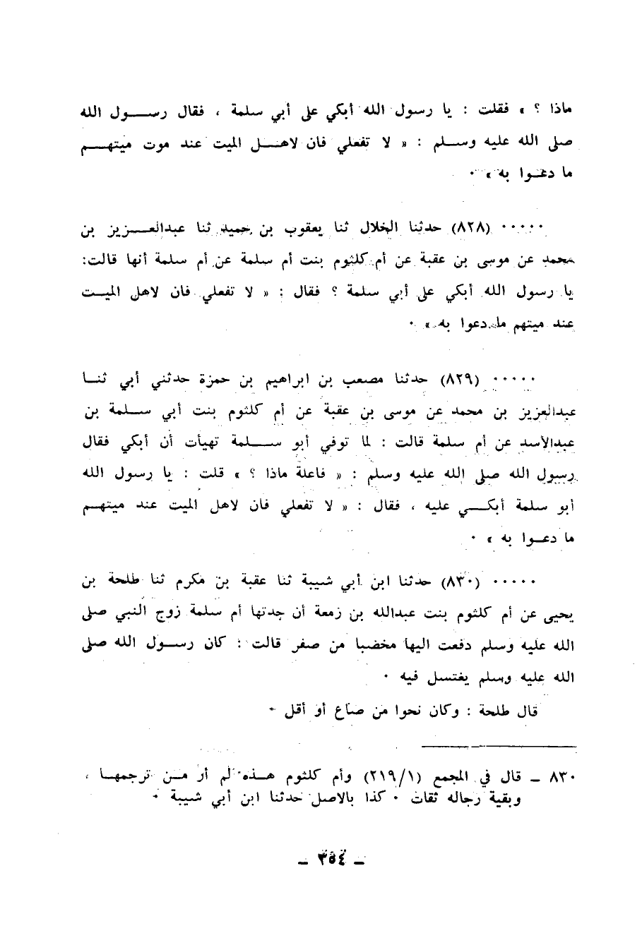 828 - حَدَّثَنَا الْخَلَّالُ، ثنا يَعْقُوبُ بْنُ حُمَيْدٍ، ثنا عَبْدُ الْعَزِيزِ بْنُ مُحَمَّدٍ، عَنْ مُوسَى بْنِ عُقْبَةَ، عَنْ أُمِّ كُلْثُومٍ بِنْتِ أُمِّ سَلَمَةَ، عَنْ أُمِّ سَلَمَةَ، أَنَّهَا قَالَتْ: يَا رَسُولَ اللهِ أَبْكِي عَلَى أَبِي سَلَمَةَ؟ فَقَالَ: «لَا تَفْعَلِي، فَإِنَّ §لِأَهْلِ الْمَيِّتِ عِنْدَ مَيِّتِهِمْ مَا دَعَوْا بِهِ»