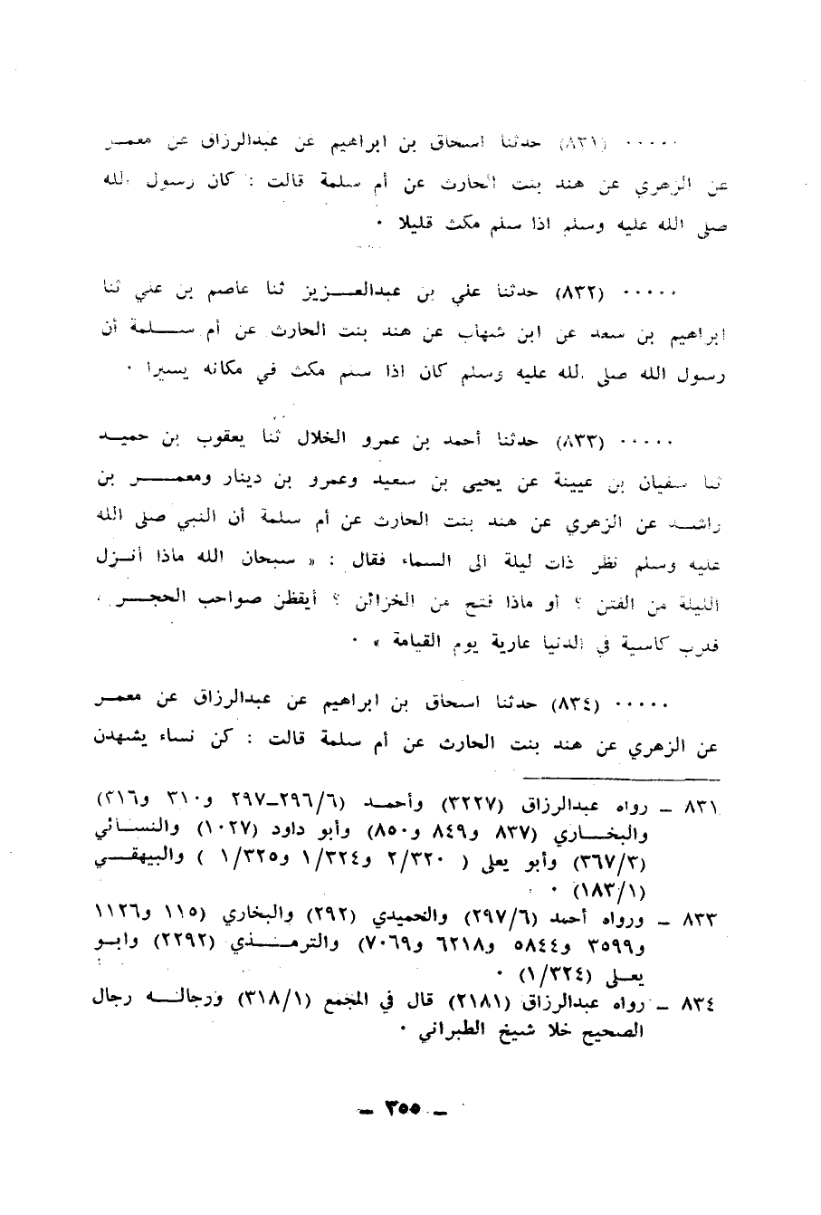 831 - حَدَّثَنَا إِسْحَاقُ بْنُ إِبْرَاهِيمَ، عَنْ عَبْدِ الرَّزَّاقِ، عَنْ مَعْمَرٍ، عَنِ الزُّهْرِيِّ، عَنْ هِنْدَ بِنْتِ الْحَارِثِ، عَنْ أُمِّ سَلَمَةَ، قَالَتْ: كَانَ رَسُولُ اللهِ صَلَّى اللهُ عَلَيْهِ وَسَلَّمَ «§إِذَا سَلَّمَ مَكَثَ قَلِيلًا»