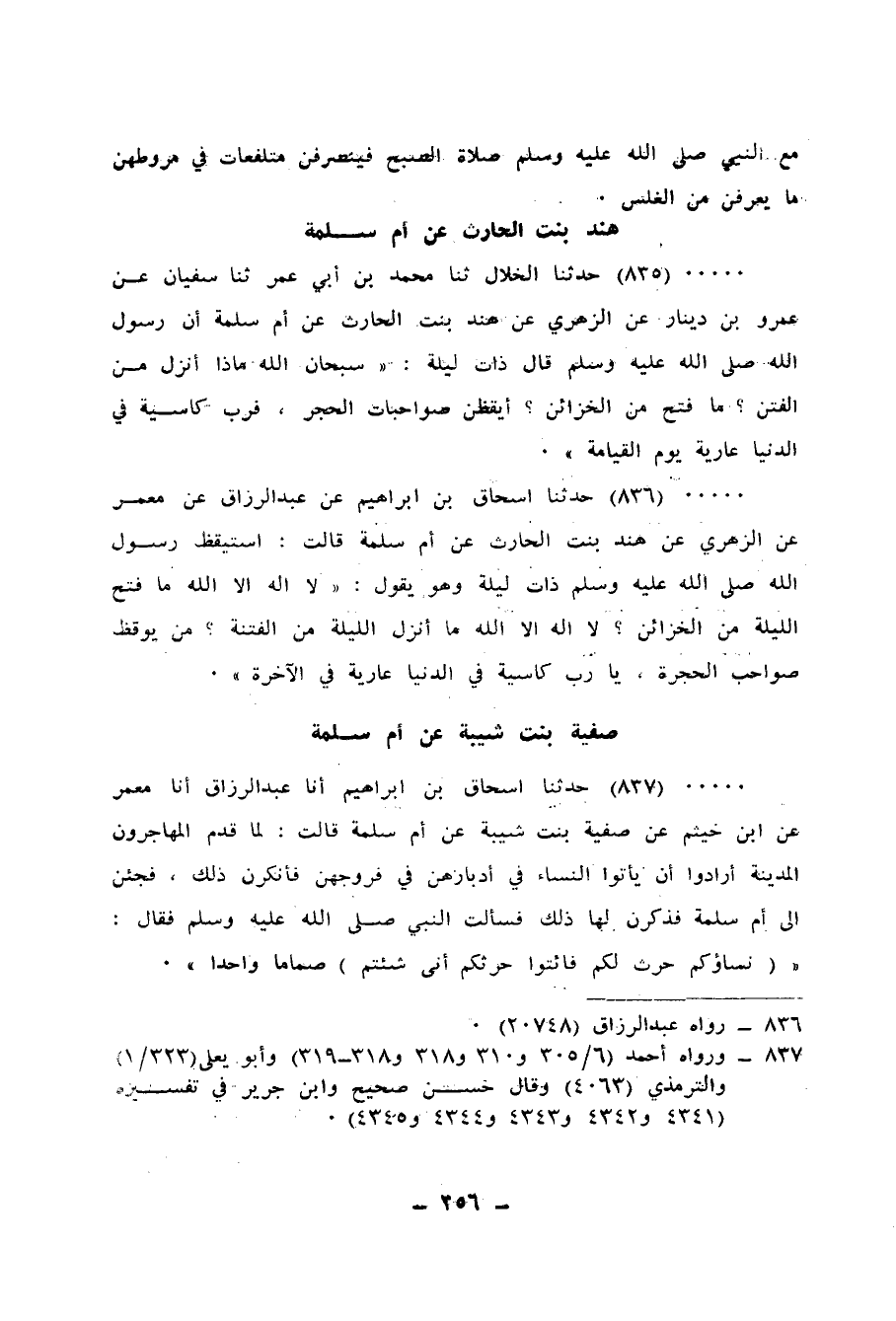 836 - حَدَّثَنَا إِسْحَاقُ بْنُ إِبْرَاهِيمَ، عَنْ عَبْدِ الرَّزَّاقِ، عَنْ مَعْمَرٍ، عَنِ الزُّهْرِيِّ، عَنْ هِنْدَ بِنْتِ الْحَارِثِ، عَنْ أُمِّ سَلَمَةَ، قَالَتْ: اسْتَيْقَظَ رَسُولُ اللهِ صَلَّى اللهُ عَلَيْهِ وَسَلَّمَ ذَاتَ لَيْلَةٍ وَهُوَ، يَقُولُ: «§لَا إِلَهَ إِلَّا اللهُ مَا فُتِحَ اللَّيْلَةَ مِنَ الْخَزَائِنِ؟، لَا إِلَهَ إِلَّا اللهُ مَا أُنْزِلَ اللَّيْلَةَ مِنَ الْفِتْنَةِ؟ مَنْ يُوقِظُ صَوَاحِبَ الْحُجْرَةِ، يَا رُبَّ كَاسِيَةٍ فِي الدُّنْيَا عَارِيَةٌ فِي الْآخِرَةِ»