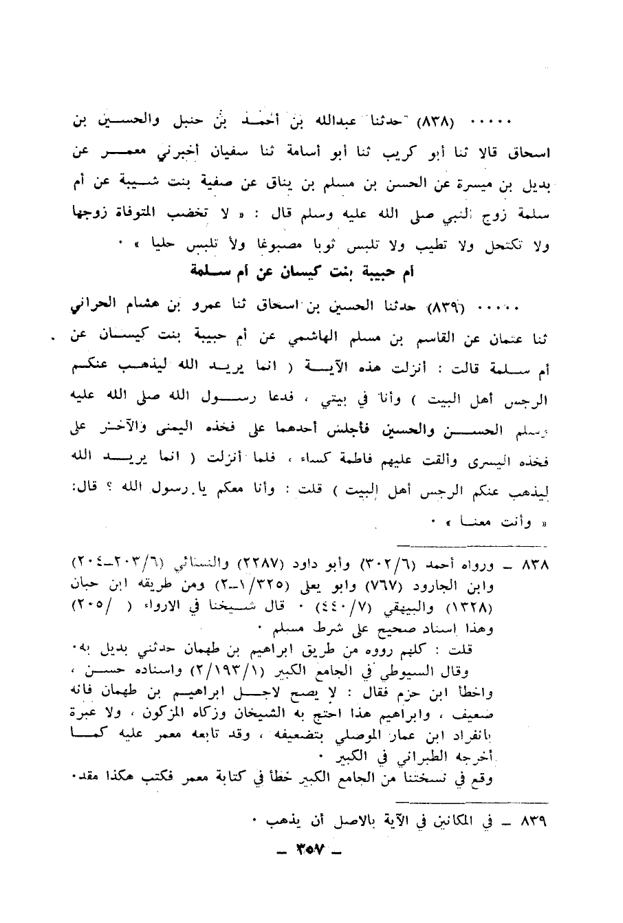 839 - حَدَّثَنَا الْحُسَيْنُ بْنُ إِسْحَاقَ، ثنا عَمْرُو بْنُ هِشَامٍ الْحَرَّانِيُّ، ثنا عُثْمَانُ، عَنِ الْقَاسِمِ بْنِ مُسْلِمٍ الْهَاشِمِيِّ، عَنْ أُمِّ حَبِيبَةَ بِنْتِ كَيْسَانَ، عَنْ أُمِّ سَلَمَةَ، قَالَتْ: أُنْزِلَتْ هَذِهِ الْآيَةُ {§إِنَّمَا يُرِيدُ اللهُ لِيُذْهِبَ عَنْكُمُ الرِّجْسَ أَهْلَ الْبَيْتِ} [الأحزاب: 33] ، وَأَنَا فِي بَيْتِي، فَدَعَا رَسُولُ اللهِ صَلَّى اللهُ عَلَيْهِ وَسَلَّمَ الْحَسَنَ وَالْحُسَيْنَ، فَأَجْلَسَ أَحَدَهُمَا عَلَى فَخِذِهِ الْيُمْنَى، وَالْآخَرَ عَلَى فَخِذِهِ الْيُسْرَى، وَأَلْقَتْ عَلَيْهِمْ فَاطِمَةُ كِسَاءً، فَلَمَّا أُنْزِلَتْ {إِنَّمَا يُرِيدُ اللهُ لِيُذْهِبَ عَنْكُمُ الرِّجْسَ أَهْلَ الْبَيْتِ} [الأحزاب: 33] ، قُلْتُ: وَأَنَا مَعَكُمْ يَا رَسُولَ اللهِ؟، قَالَ: «وَأَنْتِ مَعَنَا»