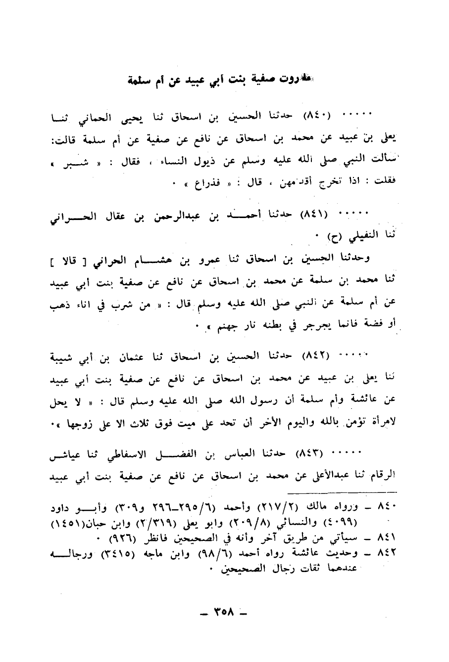 842 - حَدَّثَنَا الْحُسَيْنُ بْنُ إِسْحَاقَ، ثنا عُثْمَانُ بْنُ أَبِي شَيْبَةَ، ثنا يَعْلَى بْنُ عُبَيْدٍ، عَنْ مُحَمَّدِ بْنِ إِسْحَاقَ، عَنْ نَافِعٍ، عَنْ صَفِيَّةَ بِنْتِ أَبِي عُبَيْدٍ، عَنْ عَائِشَةَ، وَأُمِّ سَلَمَةَ، أَنَّ رَسُولَ اللهِ صَلَّى اللهُ عَلَيْهِ وَسَلَّمَ، قَالَ: «§لَا يَحِلُّ لِامْرَأَةٍ تُؤْمِنُ بِاللهِ وَالْيَوْمِ الْآخِرِ أَنْ تُحِدَّ عَلَى مَيِّتٍ فَوْقَ ثَلَاثٍ إِلَّا عَلَى زَوْجِهَا»