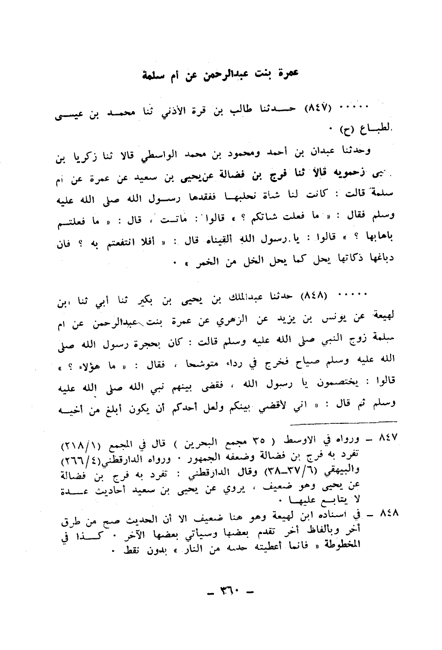 847 - حَدَّثَنَا طَالِبُ بْنُ قُرَّةَ الْأَذَنِيُّ، ثنا مُحَمَّدُ بْنُ عِيسَى الطَّبَّاعُ، ح وَحَدَّثَنَا عَبْدَانُ بْنُ أَحْمَدَ، وَمَحْمُودُ بْنُ مُحَمَّدٍ الْوَاسِطِيُّ، قَالَا: ثنا زَكَرِيَّا بْنُ يَحْيَى زَحْمَوَيْهِ، قَالَا: ثنا فَرَجُ بْنُ فَضَالَةَ، عَنْ يَحْيَى بْنِ سَعِيدٍ، عَنْ عَمْرَةَ، عَنْ أُمِّ سَلَمَةَ، قَالَتْ: كَانَتْ لَنَا شَاةٌ نَحْلُبُهَا فَفَقَدَهَا رَسُولُ اللهِ صَلَّى اللهُ عَلَيْهِ وَسَلَّمَ فَقَالَ: «مَا فَعَلَتْ شَاتُكُمْ؟» ، قَالُوا: مَاتَتْ، قَالَ: «مَا فَعَلْتُمْ بِإِهَابِهَا؟» ، قَالُوا: يَا رَسُولَ اللهِ أَلْقَيْنَاهُ، قَالَ: «أَفَلَا انْتَفَعْتُمْ بِهِ؟، فَإِنَّ §دِبَاغُهَا ذَكَاتُهَا يَحِلُّ كَمَا يَحِلُّ الْخَلُّ مِنَ الْخَمْرِ»