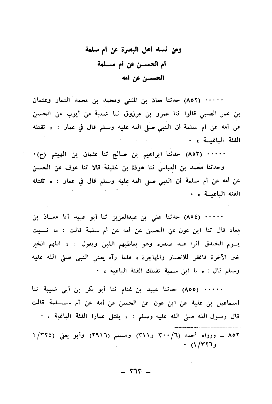 855 - حَدَّثَنَا عُبَيْدُ بْنُ غَنَّامٍ، ثنا أَبُو بَكْرِ بْنُ أَبِي شَيْبَةَ، ثنا إِسْمَاعِيلُ بْنُ عُلَيَّةَ، عَنِ ابْنِ عَوْنٍ، عَنِ الْحَسَنِ، عَنْ أُمِّهِ، عَنْ أُمِّ سَلَمَةَ، قَالَتْ: قَالَ رَسُولُ اللهِ صَلَّى اللهُ عَلَيْهِ وَسَلَّمَ: «§تَقْتُلُ عَمَّارًا الْفِئَةُ الْبَاغِيَةُ»