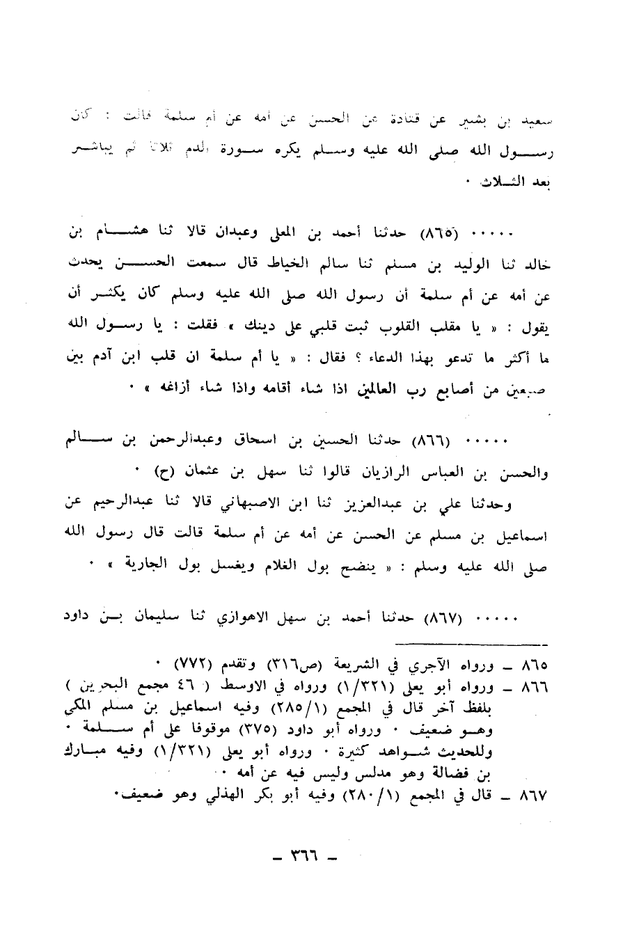 865 - حَدَّثَنَا أَحْمَدُ بْنُ الْمُعَلَّى، وَعَبْدَانُ، قَالَا: ثنا هِشَامُ بْنُ خَالِدٍ، ثنا الْوَلِيدُ بْنُ مُسْلِمٍ، ثنا سَالِمٌ الْخَيَّاطُ، قَالَ: سَمِعْتُ الْحَسَنَ يُحَدِّثُ، عَنْ أُمِّهِ، عَنْ أُمِّ سَلَمَةَ، أَنَّ رَسُولَ اللهِ صَلَّى اللهُ عَلَيْهِ وَسَلَّمَ كَانَ يُكْثِرُ أَنْ، يَقُولَ: «يَا مُقَلِّبَ الْقُلُوبِ ثَبِّتْ قَلْبِي عَلَى دِينِكَ» ، فَقُلْتُ: يَا رَسُولَ اللهِ مَا أَكْثَرَ مَا تَدْعُو بِهَذَا الدُّعَاءِ؟، فَقَالَ: «يَا أُمَّ سَلَمَةَ إِنَّ §قَلْبَ ابْنِ آدَمَ بَيْنَ أُصْبُعَيْنِ مِنْ أَصَابِعِ رَبِّ الْعَالَمِينَ إِذَا شَاءَ أَقَامَهُ وَإِذَا شَاءَ أَزَاغَهُ»