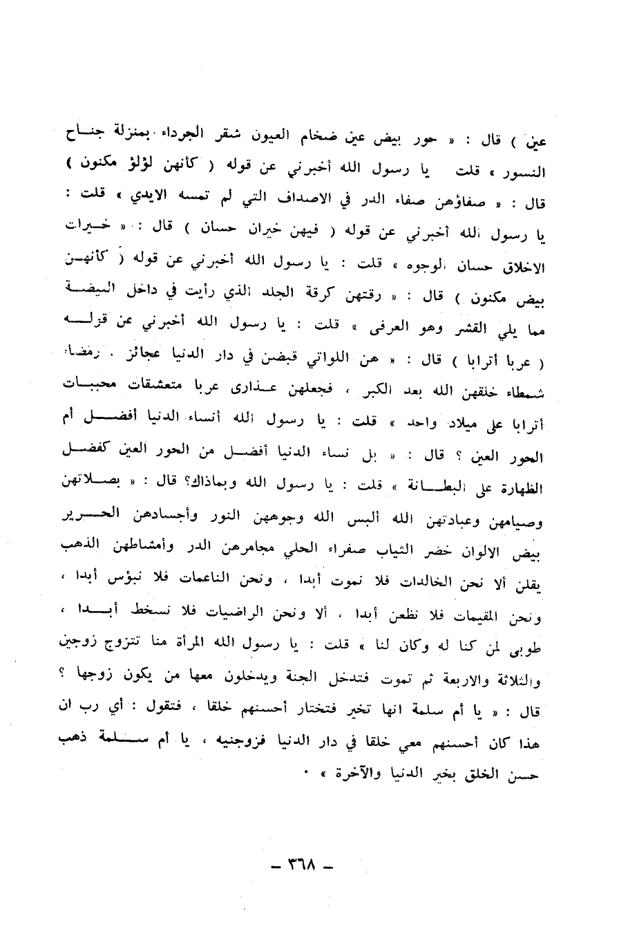 قَالَ : هُنَّ اللَّوَاتِي قُبِضْنَ فِي دَارِ الدُّنْيَا عَجَائِزَ رَمْضَاءَ شَمْطَاءَ خَلَقَهُنَّ اللَّهُ بَعْدَ الْكِبَرِ ، فَجَعَلَهُنَّ عَذَارَى عُرُبًا مُتَعَشَّقَاتٍ مُحَبَّبَاتٍ ، أَتْرَابًا عَلَى مِيلاَدٍ وَاحِدٍ . قُلْتُ : يَا رَسُولَ اللهِ أَنِسَاءُ الدُّنْيَا أَفْضَلُ أَمِ الْحُورُ الْعِينُ ؟ قَالَ : بَلْ نِسَاءُ الدُّنْيَا أَفْضَلُ مِنَ الْحُورِ الْعِينِ كَفَضْلِ الظِّهَارَةِ عَلَى الْبِطَانَةِ . قُلْتُ : يَا رَسُولَ اللهِ وَبِمَا ذَاكَ ؟ قَالَ : بِصَلاَتِهِنَّ وَصِيَامِهِنَّ وَعِبَادَتِهِنَّ اللَّهَ أَلْبَسَ اللَّهُ وُجُوهَهُنَّ النُّورَ ، وَأَجْسَادَهُنَّ الْحَرِيرَ بِيضَ الأَلْوَانِ خُضْرَ الثِّيَابِ صَفْرَاءَ الْحُلِيِّ مَجَامِرُهُنَّ الدُّرُّ وَأَمْشَاطُهُنَّ الذَّهَبُ يَقُلْنَ : أَلاَ نَحْنُ الْخَالِدَاتُ فَلاَ نَمُوتُ أَبَدًا ، أَلاَ وَنَحْنُ النَّاعِمَاتُ فَلاَ نَبْؤُسُ أَبَدًا ، أَلاَ وَنَحْنُ الْمُقِيمَاتُ فَلاَ نَظْعَنُ أَبَدًا ، أَلاَ وَنَحْنُ الرَّاضِيَاتُ فَلاَ نَسْخَطُ أَبَدًا طُوبَى لِمَنْ كُنَّا لَهُ وَكَانَ لَنَا ، قُلْتُ : يَا رَسُولَ اللهِ الْمَرْأَةُ مِنَّا تَتَزَوَّجُ الزَّوْجَيْنِ وَالثَّلاَثَةَ وَالأَرْبَعَةَ ثُمَّ تَمُوتُ فَتَدْخُلُ الْجَنَّةَ وَيَدْخُلُونَ مَعَهَا مَنْ يَكُونُ زَوْجُهَا ؟ قَالَ : يَا أُمَّ سَلَمَةَ إِنَّهَا تُخَيَّرُ فَتَخْتَارُ أَحْسَنَهُمْ خُلُقًا فَتَقُولُ : أَيْ رَبِّ إِنَّ هَذَا كَانَ أَحْسَنَهُمْ مَعِي خُلُقًا فِي دَارِ الدُّنْيَا فَزَوِّجْنِيهِ ، يَا أُمَّ سَلَمَةَ ذَهَبَ حُسْنُ الْخُلُقِ بِخَيْرِ الدُّنْيَا وَالآخِرَةِ.