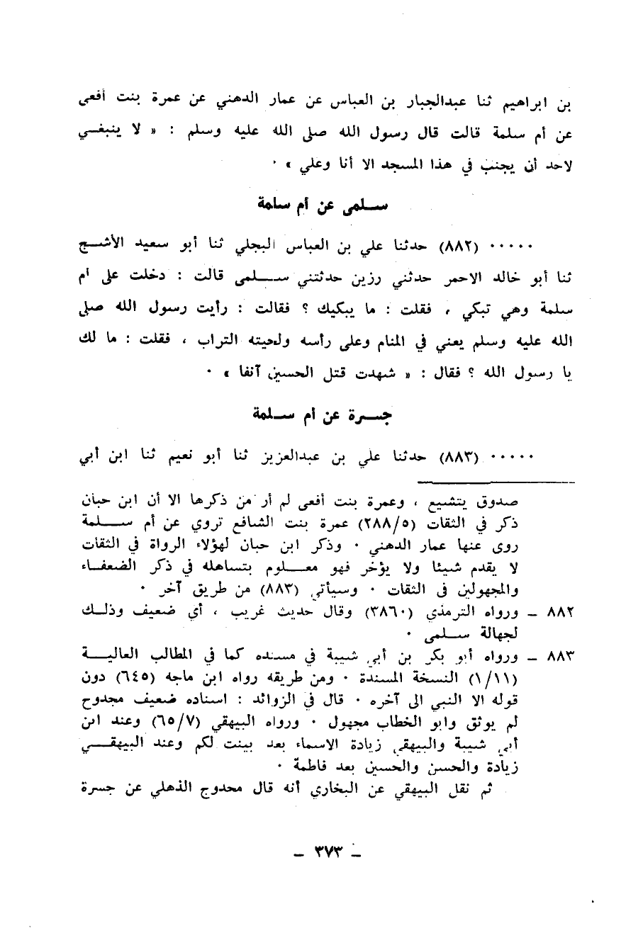 882 - حَدَّثَنَا عَلِيُّ بْنُ الْعَبَّاسِ الْبَجَلِيُّ، ثنا أَبُو سَعِيدٍ الْأَشَجُّ، ثنا أَبُو خَالِدٍ الْأَحْمَرُ، حَدَّثَنِي رَزِينٌ، حَدَّثَتْنِي سَلْمَى، قَالَتْ: دَخَلْتُ عَلَى أُمِّ سَلَمَةَ وَهِيَ تَبْكِي، فَقُلْتُ: مَا يُبْكِيكِ؟، فَقَالَتْ: رَأَيْتُ رَسُولَ اللهِ صَلَّى اللهُ عَلَيْهِ وَسَلَّمَ، يَعْنِي فِي الْمَنَامِ، وَعَلَى رَأْسِهِ وَلِحْيَتِهِ التُّرَابُ، فَقُلْتُ: مَا لَكَ يَا رَسُولَ اللهِ؟، فَقَالَ: «§شَهِدْتُ قَتْلَ الْحُسَيْنِ آنِفًا»