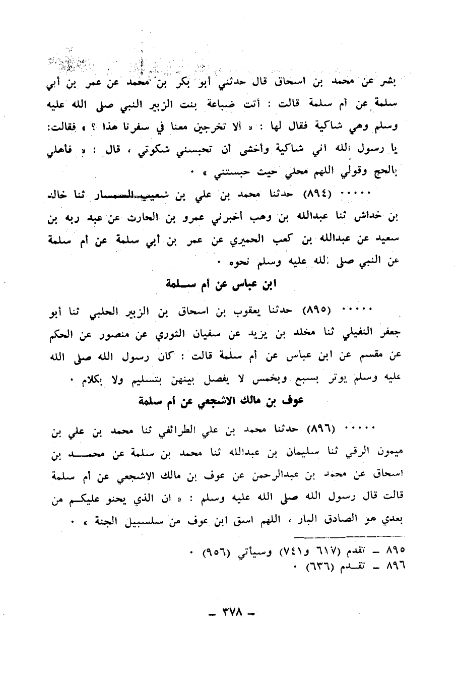 896 - حَدَّثَنَا مُحَمَّدُ بْنُ عَلِيٍّ الطَّرَائِفِيُّ، ثنا مُحَمَّدُ بْنُ عَلِيِّ بْنِ مَيْمُونٍ الرَّقِّيُّ، ثنا سُلَيْمَانُ بْنُ عَبْدِ اللهِ، ثنا مُحَمَّدُ بْنُ سَلَمَةَ، عَنْ مُحَمَّدِ بْنِ إِسْحَاقَ، عَنْ مُحَمَّدِ بْنِ عَبْدِ الرَّحْمَنِ، عَنْ عَوْفِ بْنِ مَالِكٍ الْأَشْجَعِيِّ، عَنْ أُمِّ سَلَمَةَ، قَالَتْ: قَالَ رَسُولُ اللهِ صَلَّى اللهُ عَلَيْهِ وَسَلَّمَ: «إِنَّ §الَّذِي يَحْنُو عَلَيْكُمْ مِنْ بَعْدِي هُوَ الصَّادِقُ الْبَارُّ، اللهُمَّ اسْقِ ابْنَ عَوْفٍ مِنْ سَلْسَبِيلِ الْجَنَّةِ»