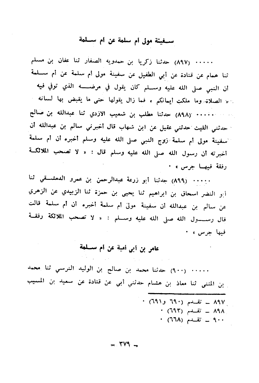 897 - حَدَّثَنَا زَكَرِيَّا بْنُ حَمْدَوَيْهِ الصَّفَّارُ، ثنا عَفَّانُ بْنُ مُسْلِمٍ، ثنا هَمَّامٌ، عَنْ قَتَادَةَ، عَنْ أَبِي الطُّفَيْلِ، عَنْ سَفِينَةَ مَوْلَى أُمِّ سَلَمَةَ، عَنْ أُمِّ سَلَمَةَ، أَنَّ النَّبِيَّ صَلَّى اللهُ عَلَيْهِ وَسَلَّمَ كَانَ يَقُولُ فِي مَرَضِهِ الَّذِي تُوُفِّيَ فِيهِ: «§الصَّلَاةُ وَمَا مَلَكَتْ أَيْمَانُكُمْ» فَمَا زَالَ يَقُولُهَا حَتَّى مَا يُقْبَضُ بِهَا لِسَانُهُ
