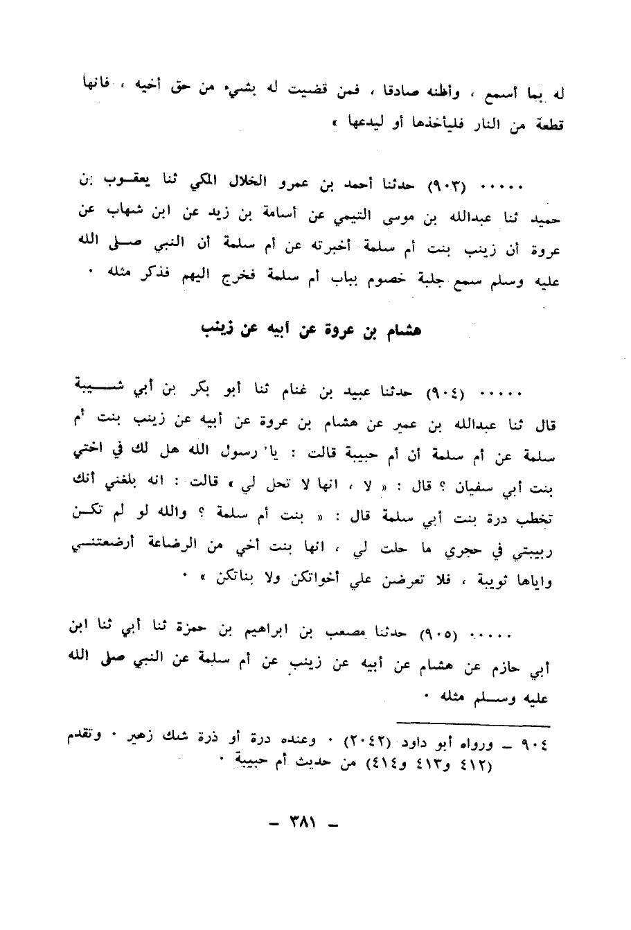 905 - حَدَّثَنَا مُصْعَبُ بْنُ إِبْرَاهِيمَ بْنِ حَمْزَةَ، ثنا أَبِي، ثنا ابْنُ أَبِي حَازِمٍ، عَنْ هِشَامٍ، عَنْ أَبِيهِ، عَنْ زَيْنَبَ، عَنْ أُمِّ سَلَمَةَ، عَنِ النَّبِيِّ صَلَّى اللهُ عَلَيْهِ وَسَلَّمَ مِثْلَهُ