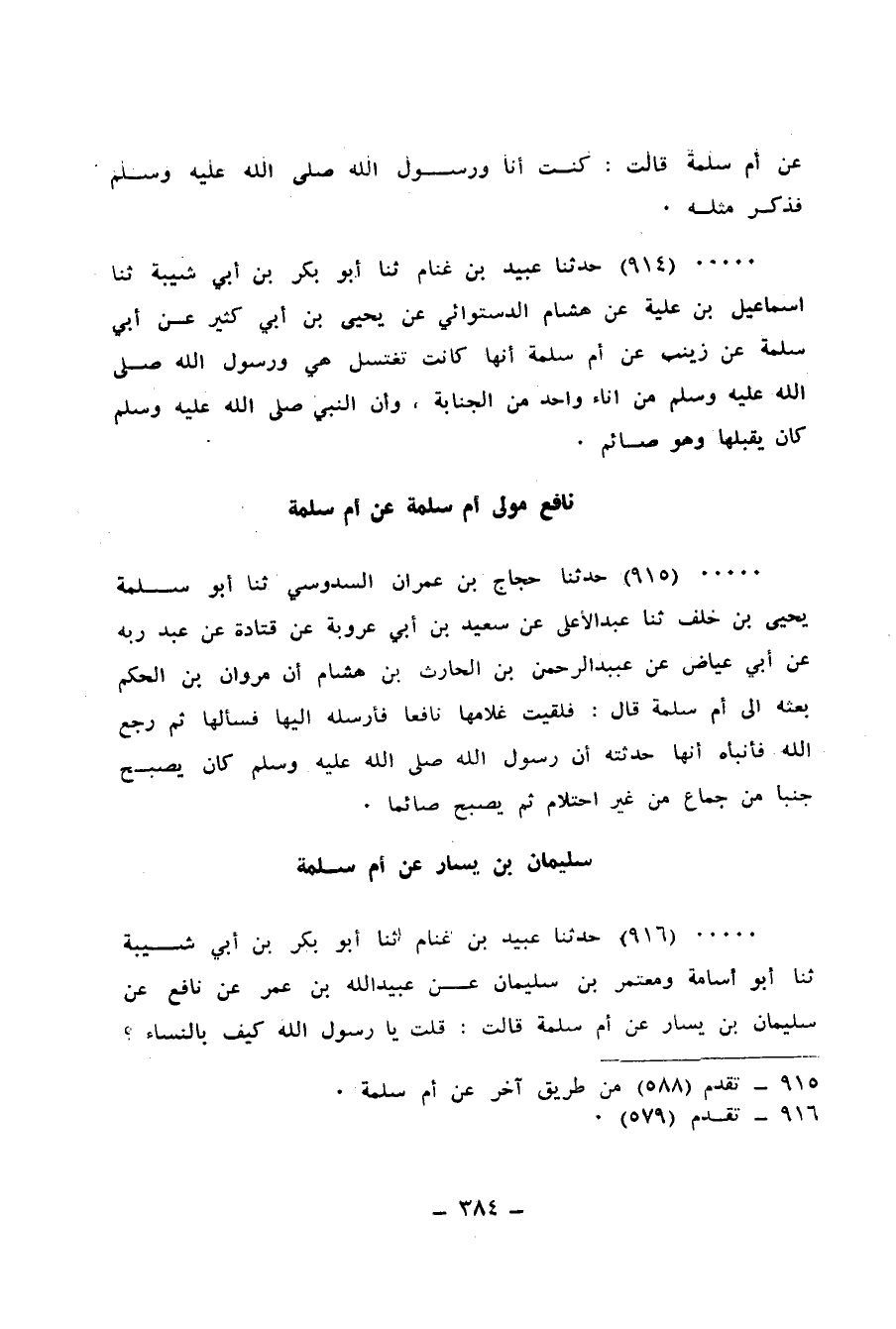 915 - حَدَّثَنَا حَجَّاجُ بْنُ عِمْرَانَ السَّدُوسِيُّ، ثنا أَبُو سَلَمَةَ يَحْيَى بْنُ خَلَفٍ، ثنا عَبْدُ الْأَعْلَى، عَنْ سَعِيدِ بْنِ أَبِي عَرُوبَةَ، عَنْ قَتَادَةَ، عَنْ عَبْدِ رَبِّهِ، عَنْ أَبِي عِيَاضٍ، عَنْ عَبْدِ الرَّحْمَنِ بْنِ الْحَارِثِ بْنِ هِشَامٍ، أَنَّ مَرْوَانَ بْنَ الْحَكَمِ بَعَثَهُ إِلَى أُمِّ سَلَمَةَ، قَالَ: فَلَقِيتُ غُلَامَهَا نَافِعًا فَأَرْسَلَهُ إِلَيْهَا فَسَأَلَهَا، ثُمَّ رَجَعَ إِلَيْهِ فَأَنْبَأَهُ أَنَّهَا حَدَّثَتْهُ، أَنَّ رَسُولَ اللهِ صَلَّى اللهُ عَلَيْهِ وَسَلَّمَ كَانَ «§يُصْبِحُ جُنُبًا مِنْ جِمَاعٍ مِنْ غَيْرِ احْتِلَامٍ، ثُمَّ يُصْبِحُ صَائِمًا»
