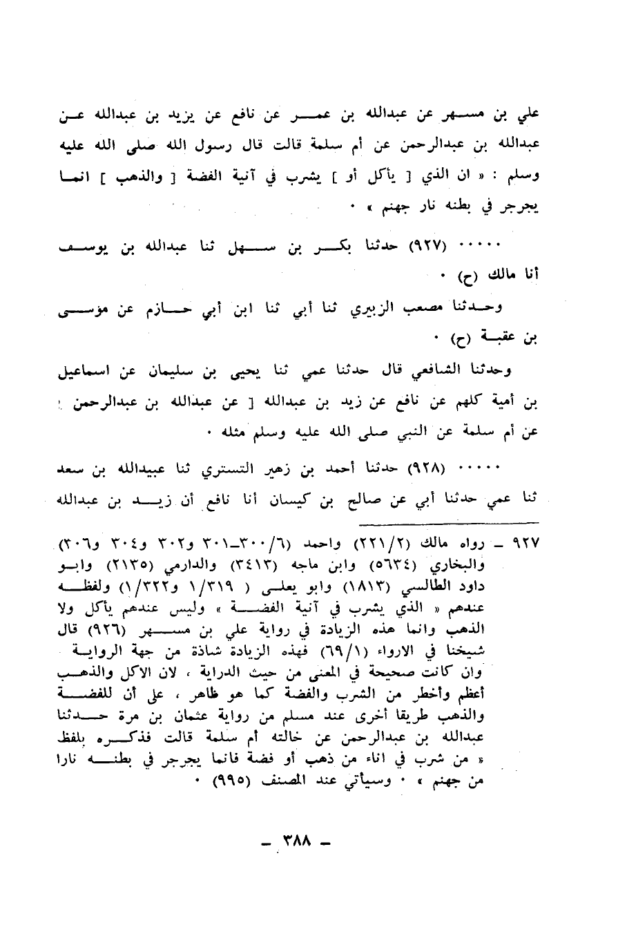928 - حَدَّثَنَا أَحْمَدُ بْنُ زُهَيْرٍ التُّسْتَرِيُّ، ثنا عُبَيْدُ اللهِ بْنُ سَعْدٍ، ثنا عَمِّي، حَدَّثَنَا أَبِي، عَنْ صَالِحِ بْنِ كَيْسَانَ، أَنَا نَافِعٌ، أَنَّ زَيْدَ بْنَ عَبْدِ اللهِ أَخْبَرَهُ، أَنَّ عَبْدَ اللهِ بْنَ عَبْدِ الرَّحْمَنِ بْنِ أَبِي بَكْرٍ أَخْبَرَهُ، أَنَّ أُمَّ سَلَمَةَ أَخْبَرَتْهُ، أَنَّ رَسُولَ اللهِ صَلَّى اللهُ عَلَيْهِ وَسَلَّمَ قَالَ: «إِنَّ §الَّذِي يَشْرَبُ فِي إِنَاءِ الْفِضَّةِ، إِنَّمَا يُجَرْجِرُ فِي بَطْنِهِ نَارَ جَهَنَّمَ، إِلَّا أَنْ يَتُوبَ»