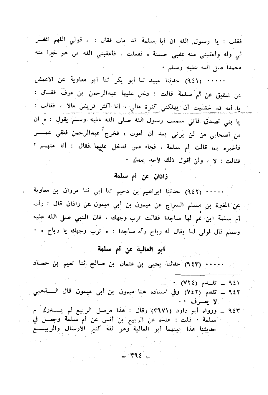 942 - حَدَّثَنَا إِبْرَاهِيمُ بْنُ دُحَيْمٍ، ثنا أَبِي، ثنا مَرْوَانُ بْنُ مُعَاوِيَةَ، عَنِ الْمُغِيرَةِ بْنِ مُسْلِمٍ السِّرَاجِ، عَنْ مَيْمُونِ بْنِ أَبِي مَيْمُونٍ، عَنْ زَاذَانَ، قَالَ: رَأَتْ أُمُّ سَلَمَةَ ابْنَ عَمٍّ لَهَا سَاجِدًا، فَقَالَتْ: تَرِبَ وَجْهُكَ فَإِنَّ النَّبِيَّ صَلَّى اللهُ عَلَيْهِ وَسَلَّمَ، قَالَ لِمَوْلًى لَنَا يُقَالُ لَهُ رَبَاحٌ رَآهُ سَاجِدًا: «§تَرِبَ وَجْهُكَ يَا رَبَاحُ»