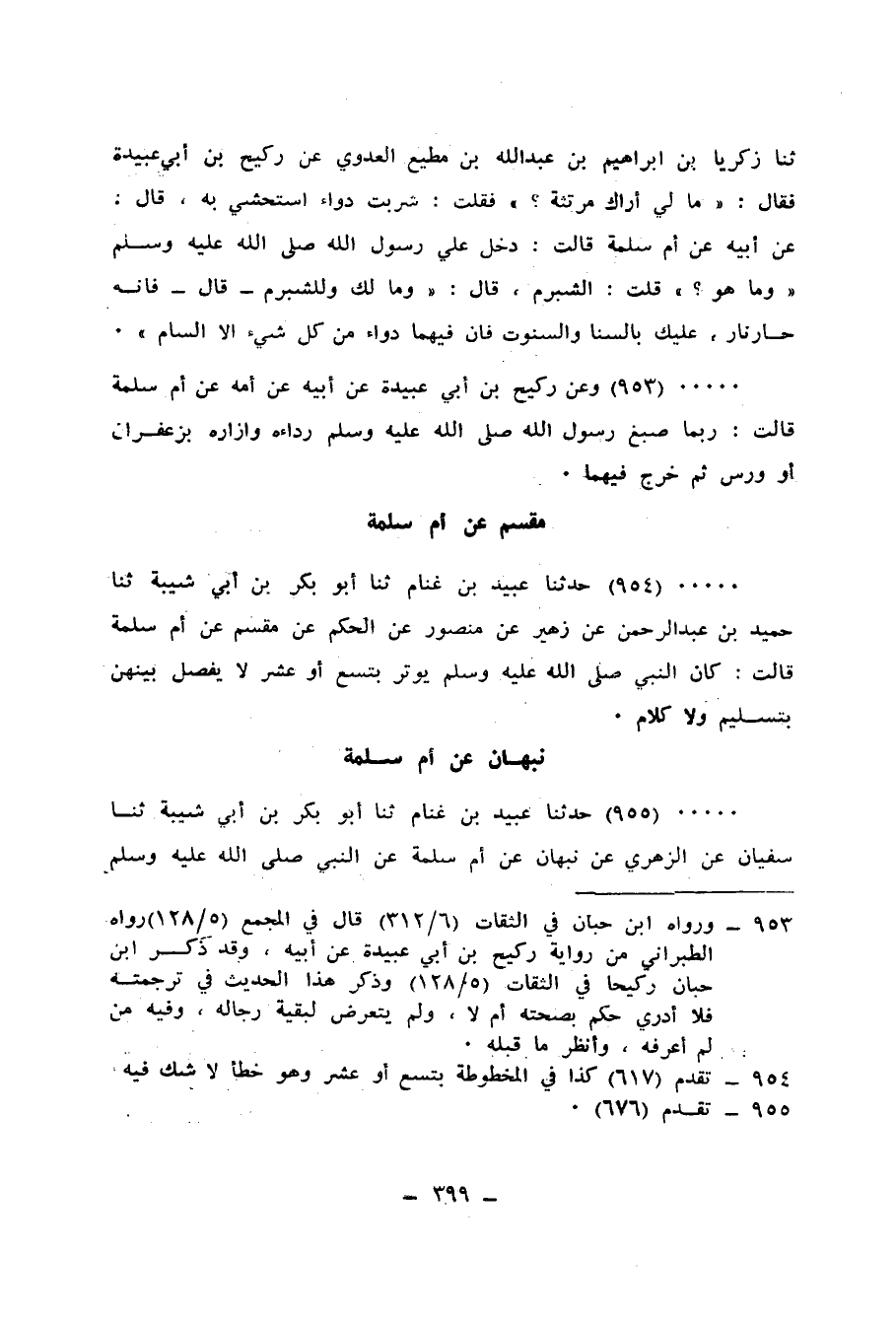 954 - حَدَّثَنَا عُبَيْدُ بْنُ غَنَّامٍ، ثنا أَبُو بَكْرِ بْنُ أَبِي شَيْبَةَ، ثنا حُمَيْدُ بْنُ عَبْدِ الرَّحْمَنِ، عَنْ زُهَيْرٍ، عَنْ مَنْصُورٍ، عَنِ الْحَكَمِ، عَنْ مِقْسَمٍ، عَنْ أُمِّ سَلَمَةَ، قَالَتْ: كَانَ النَّبِيُّ صَلَّى اللهُ عَلَيْهِ وَسَلَّمَ «§يُوتِرُ بِتِسْعٍ أَوْ عَشْرٍ لَا يَفْصِلُ بَيْنَهُنَّ بِتَسْلِيمٍ، وَلَا كَلَامٍ»