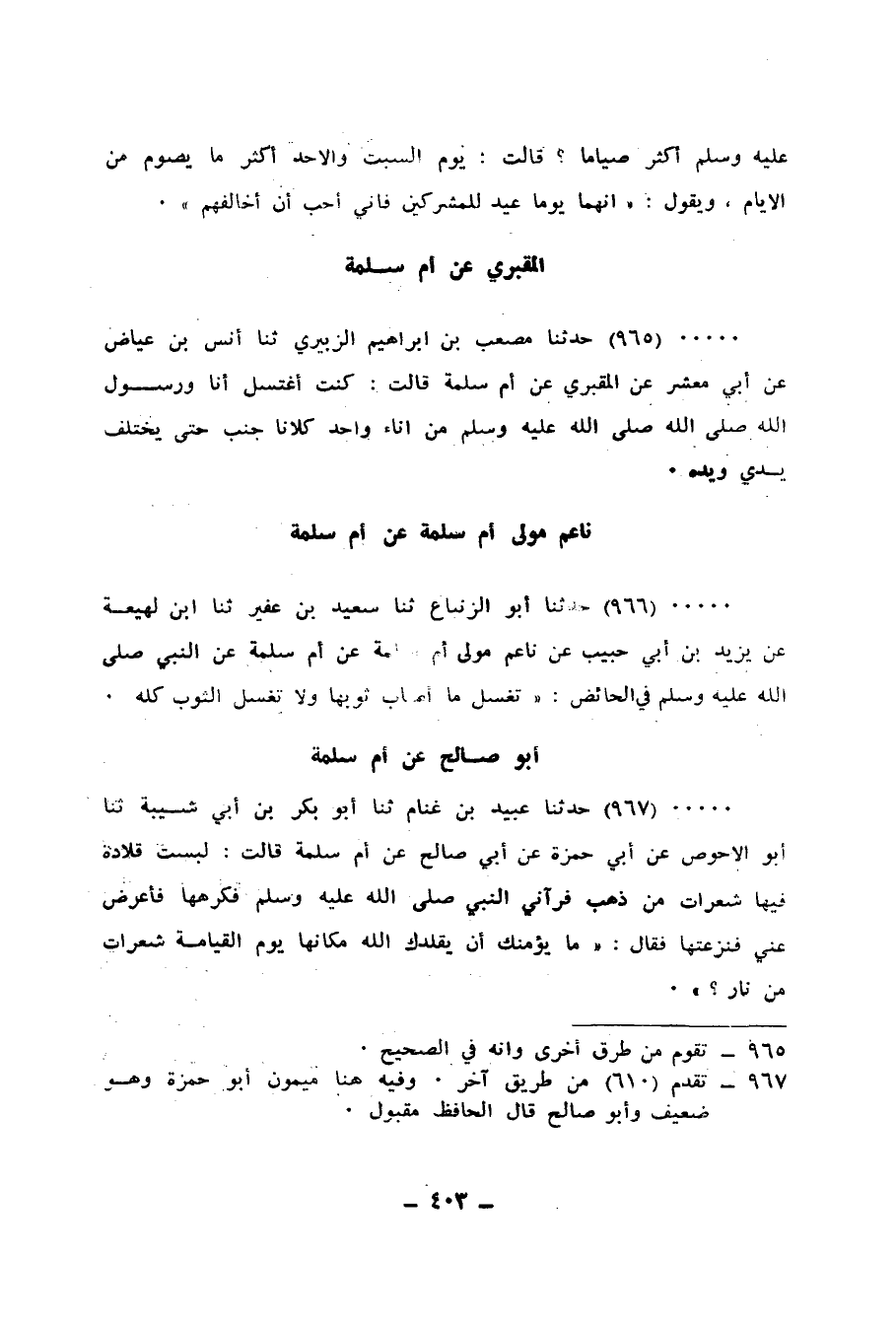 965 - حَدَّثَنَا مُصْعَبُ بْنُ إِبْرَاهِيمَ الزُّبَيْرِيُّ، ثنا أَنَسُ بْنُ عِيَاضٍ، عَنْ أَبِي مَعْشَرٍ، عَنِ الْمَقْبُرِيِّ، عَنْ أُمِّ سَلَمَةَ، قَالَتْ: «كُنْتُ §أَغْتَسِلُ أَنَا وَرَسُولُ اللهِ صَلَّى اللهُ عَلَيْهِ وَسَلَّمَ مِنْ إِنَاءٍ وَاحِدٍ كِلَانَا جُنُبٌ حَتَّى تَخْتَلِفَ يَدِي وَيَدُهُ»
