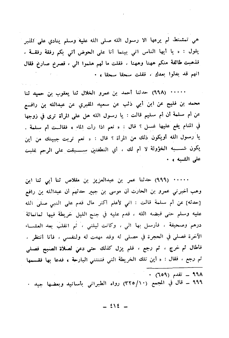 998 - حَدَّثَنَا أَحْمَدُ بْنُ عَمْرٍو الْخَلَّالُ، ثنا يَعْقُوبُ بْنُ حُمَيْدٍ، ثنا مُحَمَّدُ بْنُ فُلَيْحٍ، عَنِ ابْنِ أَبِي ذِئْبٍ، عَنْ سَعِيدٍ الْمَقْبُرِيِّ، عَنْ عَبْدِ اللهِ بْنِ رَافِعٍ، عَنْ أُمِّ سَلَمَةَ، أَنَّ أُمَّ سُلَيْمٍ، قَالَتْ: يَا رَسُولَ اللهِ هَلْ عَلَى الْمَرْأَةِ تَرَى فِي زَوْجِهَا فِي الْمَنَامِ يَقَعُ عَلَيْهَا غُسْلٌ؟، قَالَ: «نَعَمْ إِذَا رَأَتِ الْمَاءَ» ، فَقَالَتْ أُمُّ سَلَمَةَ: يَا رَسُولَ اللهِ أَوَ يَكُونُ ذَلِكَ مِنَ الْمَرْأَةِ؟، قَالَ: «نَعَمْ تَرِبَتْ جَبِينُكِ مِنْ أَيْنَ يَكُونُ شَبْهُ الْخُؤُولَةِ لَا أُمَّ لَكِ، §أَيُّ النُّطْفَتَيْنِ سَبَقَتْ عَلَى الرَّحِمِ غَلَبَتْ عَلَى الشَّبَهِ»
