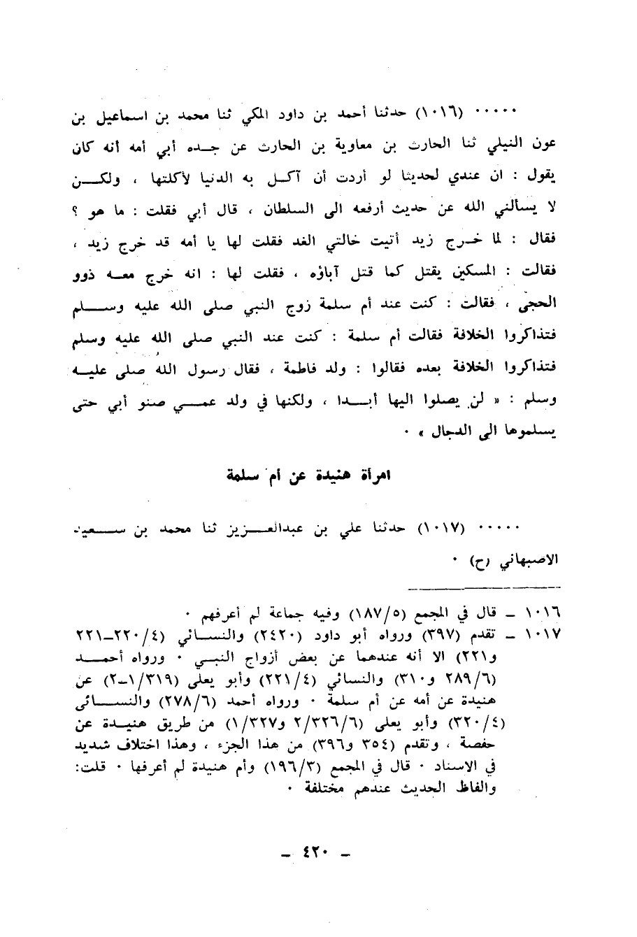 1016 - حَدَّثَنَا أَحْمَدُ بْنُ دَاوُدَ الْمَكِّيُّ، ثنا مُحَمَّدُ بْنُ إِسْمَاعِيلَ بْنِ عَوْنٍ النِّيلِيُّ، ثنا الْحَارِثُ بْنُ مُعَاوِيَةَ بْنِ الْحَارِثِ، عَنْ جَدِّهِ أَبِي أُمِّهِ، أَنَّهُ كَانَ يَقُولُ: إِنَّ عِنْدِي لَحَدِيثًا لَوْ أَرَدْتُ أَنْ آكُلَ بِهِ الدُّنْيَا لَأَكَلْتُهَا، وَلَكِنْ لَا يَسْأَلُنِي اللهُ عَنْ حَدِيثٍ أَرْفَعُهُ إِلَى السُّلْطَانِ، قَالَ أَبِي: فَقُلْتُ: مَا هُوَ؟ فَقَالَ: لَمَّا خَرَجَ زَيْدٌ أَتَيْتُ خَالَتِي الْغَدَ فَقُلْتُ لَهَا: يَا أُمَّهُ قَدْ خَرَجَ زَيْدٌ، فَقَالَتْ: الْمِسْكِينُ يُقْتُلُ كَمَا قُتِلَ آبَاؤُهُ، فَقُلْتُ لَهَا: إِنَّهُ خَرَجَ مَعَهُ ذَوُو الْحِجَى، فَقَالَتْ: كُنْتُ عِنْدَ أُمِّ سَلَمَةَ زَوْجِ النَّبِيِّ صَلَّى اللهُ عَلَيْهِ وَسَلَّمَ فَتَذَاكَرُوا الْخِلَافَةَ، فَقَالَتْ أُمُّ سَلَمَةَ: كُنْتُ عِنْدَ النَّبِيِّ صَلَّى اللهُ عَلَيْهِ وَسَلَّمَ فَتَذَاكَرُوا الْخِلَافَةَ بَعْدَهُ فَقَالُوا: وَلَدُ فَاطِمَةَ، فَقَالَ رَسُولُ اللهِ صَلَّى اللهُ عَلَيْهِ وَسَلَّمَ: «§لَنْ يَصِلُوا إِلَيْهَا أَبَدًا وَلَكِنَّهَا فِي وَلَدِ عَمِّي صِنْوِ أَبِي حَتَّى يُسْلِمُوهَا إِلَى الدَّجَّالِ»