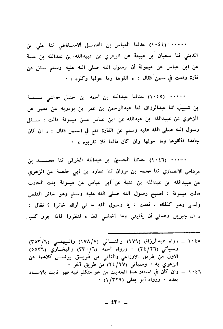 1044 - حَدَّثَنَا الْعَبَّاسُ بْنُ الْفَضْلِ الْأَسْفَاطِيُّ، ثنا عَلِيُّ بْنُ الْمَدِينِيِّ، ثنا سُفْيَانُ بْنُ عُيَيْنَةَ، عَنِ الزُّهْرِيِّ، عَنْ عُبَيْدِ اللهِ بْنِ عَبْدِ اللهِ بْنِ عُتْبَةَ، عَنِ ابْنِ عَبَّاسٍ، عَنْ مَيْمُونَةَ، أَنَّ رَسُولَ اللهِ صَلَّى اللهُ عَلَيْهِ وَسَلَّمَ سُئِلَ عَنْ §فَأْرَةٍ وَقَعَتْ فِي سَمْنٍ فَقَالَ: «أَلْقُوهَا وَمَا حَوْلَهَا وَكُلُوهُ»