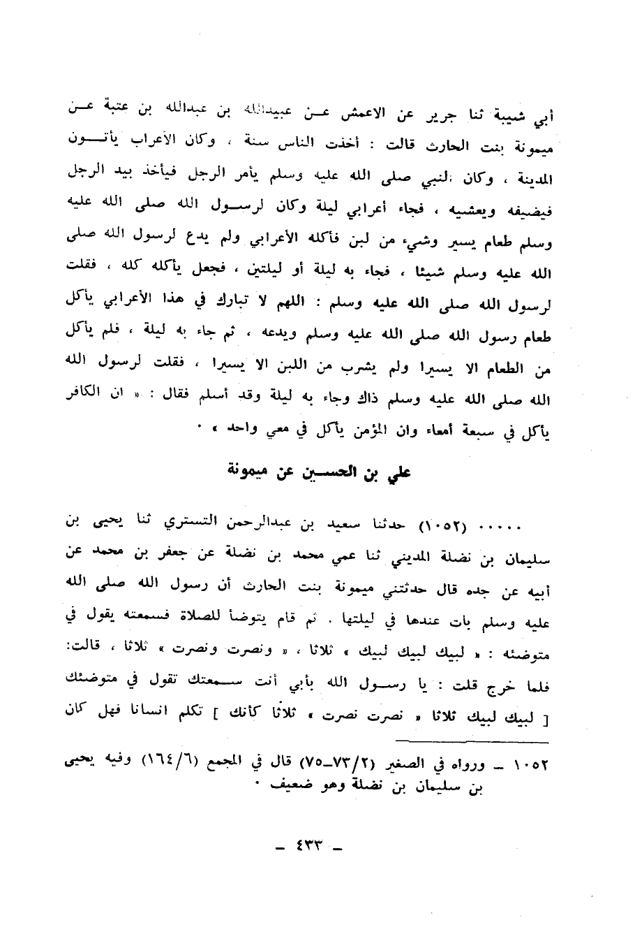 1052 - حَدَّثَنَا سَعِيدُ بْنُ عَبْدِ الرَّحْمَنِ التُّسْتَرِيُّ، ثنا يَحْيَى بْنُ سُلَيْمَانَ بْنِ نَضْلَةَ الْمَدِينِيُّ، ثنا عَمِّي مُحَمَّدُ بْنُ نَضْلَةَ، عَنْ جَعْفَرِ بْنِ مُحَمَّدٍ، عَنْ أَبِيهِ، عَنْ جَدِّهِ، قَالَ: حَدَّثَتْنِي مَيْمُونَةُ بِنْتُ الْحَارِثِ، أَنَّ رَسُولَ اللهِ صَلَّى اللهُ عَلَيْهِ وَسَلَّمَ بَاتَ عِنْدَهَا فِي لَيْلَتِهَا، ثُمَّ قَامَ يَتَوَضَّأُ لِلصَّلَاةِ فَسَمِعَتْهُ يَقُولُ فِي مُتَوَضَّئِهِ: «لَبَّيْكَ لَبَّيْكَ لَبَّيْكَ» ، ثَلَاثًا، «وَنُصِرْتُ وَنُصِرْتُ» ، ثَلَاثًا، قَالَتْ: فَلَمَّا خَرَجَ قُلْتُ: يَا رَسُولَ اللهِ بِأَبِي أَنْتَ سَمِعْتُكَ تَقُولُ فِي مُتَوَضَّئِكَ «لَبَّيْكَ لَبَّيْكَ» ، ثَلَاثًا، «وَنُصِرْتُ نُصِرْتُ» ، ثَلَاثًا، كَأَنَّكَ تُكَلِّمُ إِنْسَانًا فَهَلْ -[434]- كَانَ مَعَكَ أَحَدٌ؟ قَالَ: «§هَذَا رَاجِزُ بَنِي كَعْبٍ يَسْتَصْرِخُنُي، وَيَزْعُمُ أَنَّ قُرَيْشًا أَعَانَتْ عَلَيْهِمْ بَنِي بَكْرٍ» ، ثُمَّ خَرَجَ رَسُولُ اللهِ صَلَّى اللهُ عَلَيْهِ وَسَلَّمَ وَأَمَرَ عَائِشَةَ أَنْ تُجَهِّزَهُ وَلَا تُعْلِمُ أَحَدًا، قَالَتْ: فَدَخَلَ عَلَيْهَا أَبُوهَا فَقَالَ: يَا بُنَيَّةُ مَا هَذَا الْجِهَازُ؟ قَالَتْ: وَاللهِ مَا أَدْرِي، قَالَ: مَا هَذَا بِزَمَانِ غَزْوِ بَنِي الْأَصْفَرِ فَأَيْنَ يُرِيدُ رَسُولُ اللهِ صَلَّى اللهُ عَلَيْهِ وَسَلَّمَ؟ قَالَتْ: لَا عِلْمَ لِي، قَالَتْ: فَأَقَمْنَا ثَلَاثًا، ثُمَّ صَلَّى الصُّبْحَ بِالنَّاسِ فَسَمِعْتُ الرَّاجِزَ يَنْشُدُهُ: