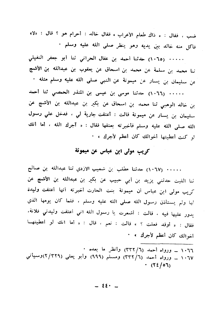1067 - حَدَّثَنَا مُطَّلِبُ بْنُ شُعَيْبٍ الْأَزْدِيُّ، ثنا عَبْدُ اللهِ بْنُ صَالِحٍ، ثنا اللَّيْثُ، حَدَّثَنِي يَزِيدُ بْنُ أَبِي حَبِيبٍ، عَنْ بُكَيْرِ بْنِ عَبْدِ اللهِ بْنِ الْأَشَجِّ، عَنْ كُرَيْبٍ، مَوْلَى ابْنِ عَبَّاسٍ، أَنَّ مَيْمُونَةَ بِنْتَ الْحَارِثِ أَخْبَرَتْهُ، أَنَّهَا أَعْتَقَتْ وَلِيدَةً لَهَا وَلَمْ يُسْتَأْذَنْ رَسُولُ اللهِ صَلَّى اللهُ عَلَيْهِ وَسَلَّمَ فَلَمَّا كَانَ يَوْمُهَا الَّذِي يَدُورُ عَلَيْهَا فِيهِ قَالَتْ: أَشَعَرْتَ يَا رَسُولَ اللهِ أَنِّي أَعْتَقْتُ وَلِيدَتِي فُلَانَةَ؟ فَقَالَ: «أَوَقَدْ فَعَلْتِ؟» قَالَتْ: نَعَمْ، قَالَ: «أَمَا إِنَّكِ §لَوْ أَعْطَيْتِهَا أَخْوَالَكِ كَانَ أَعْظَمَ لِأَجْرِكِ»