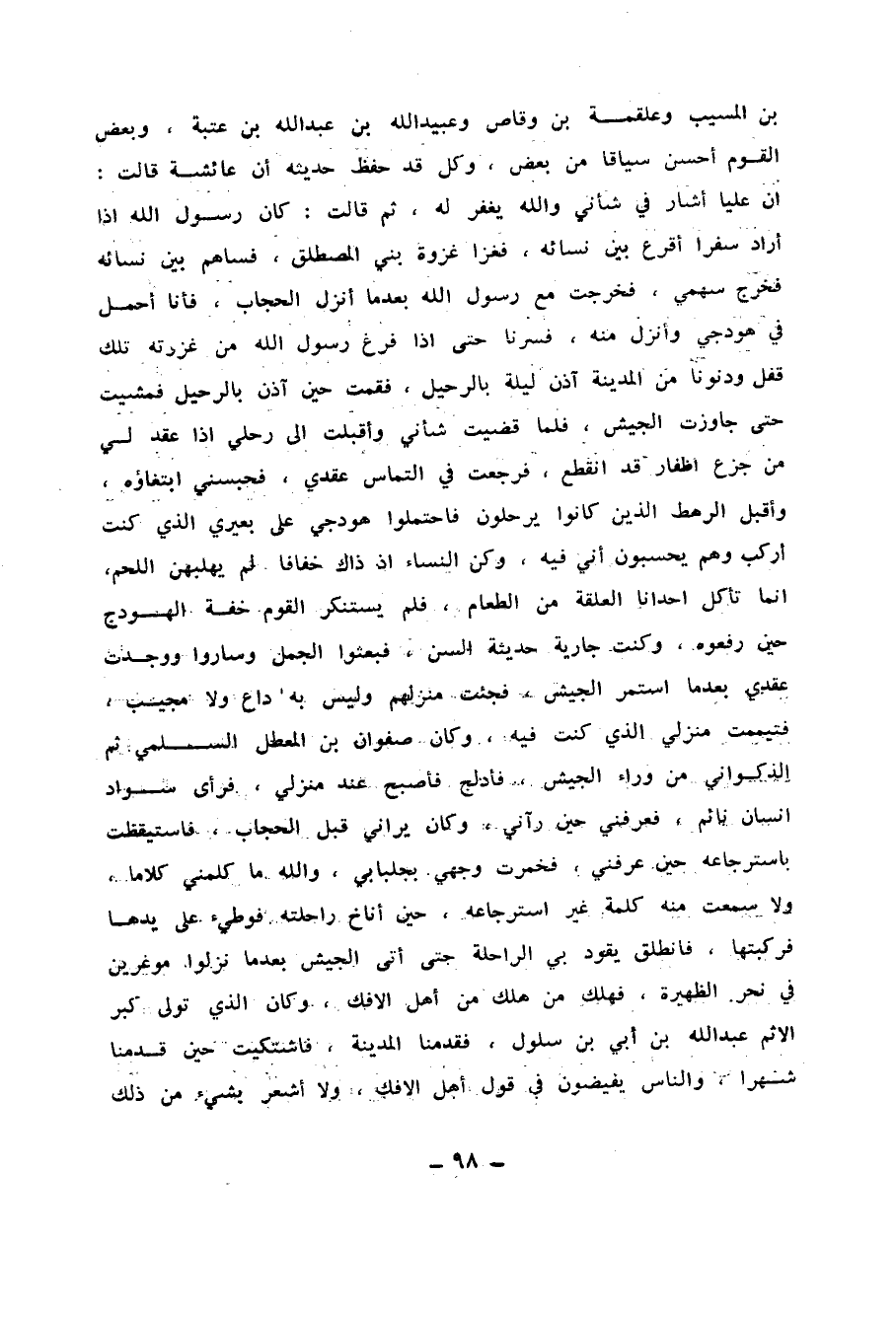 فَقُمْتُ حِينَ آذَنَ بِالرَّحِيلِ فَمَشَيْتُ حَتَّى جَاوَزْتُ الْجَيْشَ ، فَلَمَّا قَضَيْتُ شَأْنِي وَأَقْبَلْتُ إِلَى رَحْلِي إِذَا عِقْدٌ لِي مِنْ جَزْعِ أَظْفَارٍ قَدِ انْقَطَعَ ، فَرَجَعْتُ فِي الْتِمَاسِ عِقْدِي فَحَبَسَنِي ابْتِغَاؤُهُ ، وَأَقْبَلَ الرَّهْطُ الَّذِينَ كَانُوا يَرْحَلُونَ ، فَاحْتَمَلُوا هَوْدَجِي عَلَى بَعِيرِي الَّذِي كُنْتُ أَرْكَبُ ، وَهُمْ يَحْسِبُونَ أَنِّي فِيهِ وَكُنَّ النِّسَاءُ إِذْ ذَاكَ خِفَافًا لَمْ يُهَبِّلْهُنَّ اللَّحْمُ ، إِنَّمَا تَأْكُلُ إِحْدَانَا الْعُلْقَةَ مِنَ الطَّعَامِ ، فَلَمْ يَسْتَنْكِرِ الْقَوْمُ خِفَّةَ الْهَوْدَجِ حِينَ رَفَعُوهُ ، وَكُنْتُ جَارِيَةً حَدِيثَةَ السِّنِّ ، فَبَعَثُوا الْجَمَلَ وَسَارُوا ، وَوَجَدْتُ عِقْدِي بَعْدَ مَا اسْتَمَرَّ الْجَيْشُ ، فَجِئْتُ مَنْزِلَهُمْ وَلَيْسَ بِهِ دَاعٍ وَلاَ مُجِيبٌ ، فَتَيَمَّمْتُ مَنْزِلِي الَّذِي كُنْتُ فِيهِ ، فَظَنَنْتُ أَنَّهُمْ سَيَفْقِدُونِي فَيَرْجِعُونَ إِلَيَّ ، فَبَيْنَا أَنَا جَالِسَةٌ فِي مَنْزِلِي غَلَبَتْنِي عَيْنِي فَنِمْتُ ، وَكَانَ صَفْوَانُ بْنُ الْمُعَطَّلِ السُّلَمِيُّ ثُمَّ الذَّكْوَانِيُّ مِنْ وَرَاءِ الْجَيْشِ فَأَدْلَجَ فَأَصْبَحَ عِنْدَ مَنْزِلِي ، فَرَأَى سَوَادَ إِنْسَانٍ نَائِمٍ ، فَعَرَفَنِي حِينَ رَآنِي وَكَانَ يَرَانِي قَبْلَ الْحِجَابِ ، فَاسْتَيْقَظْتُ بِاسْتِرْجَاعِهِ حِينَ عَرَفَنِي ، فَخَمَّرْتُ وَجْهِي بِجِلْبَابِي ، وَاللَّهِ مَا كَلَّمَنِي كَلاَمًا وَلاَ سَمِعْتُ مِنْهُ كَلِمَةً غَيْرَ اسْتِرْجَاعِهِ حِينَ أَنَاخَ رَاحِلَتَهُ ، فَوَطِئَ عَلَى يَدِهَا فَرَكِبْتُهَا ، فَانْطَلَقَ يَقُودُ بِيَ الرَّاحِلَةَ ، حَتَّى أَتَى الْجَيْشَ بَعْدَ مَا نَزَلُوا مُوغِرِينَ فِي نَحْرِ الظَّهِيرَةِ ، فَهَلَكَ مَنْ هَلَكَ مِنْ أَهْلِ الإِفْكِ ، وَكَانَ الَّذِي تَوَلَّى كِبْرَ الإِثْمِ عَبْدُ اللهِ بْنُ أُبَيِّ بْنِ سَلُولٍ ، فَقَدِمْنَا الْمَدِينَةَ فَاشْتَكَيْتُ حِينَ قَدِمْنَا شَهْرًا وَالنَّاسُ يُفِيضُونَ فِي قَوْلِ أَهْلِ الإِفْكِ ، وَلاَ أَشْعُرُ بِشَيْءٍ مِنْ ذَلِكَ ،