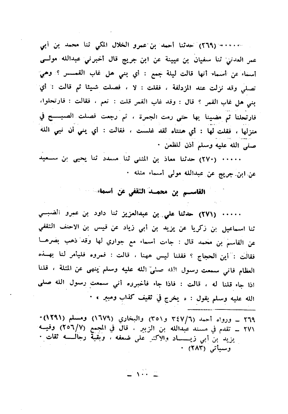 269 - حَدَّثَنَا أَحْمَدُ بْنُ عَمْرٍو الْخَلَّالُ الْمَكِّيُّ، ثنا مُحَمَّدُ بْنُ أَبِي عُمَرَ الْعَدَنِيُّ، ثنا سُفْيَانُ بْنُ عُيَيْنَةَ، عَنِ ابْنِ جُرَيْجٍ، قَالَ: أَخْبَرَنِي عَبْدُ اللهِ، مَوْلَى أَسْمَاءَ، عَنْ أَسْمَاءَ، أَنَّهَا قَالَتْ لَيْلَةَ جَمْعٍ: أَيْ بُنَيَّ، هَلْ غَابَ الْقَمَرُ؟ وَهِيَ تُصَلِّي وَقَدْ نَزَلَتْ عِنْدَ الْمُزْدَلِفَةِ، فَقُلْتُ: لَا، فَصَلَّتْ شَيْئًا، ثُمَّ قَالَتْ: أَيْ بُنَيَّ، هَلْ غَابَ الْقَمَرُ؟ قَالَ: وَقَدْ غَابَ الْقَمَرُ، قُلْتُ: نَعَمْ، فَقَالَتْ: فَارْتَحِلُوا فَارْتَحَلْنَا، ثُمَّ مَضَيْنَا بِهَا حَتَّى رَمَتِ الْجَمْرَةَ، ثُمَّ رَجَعَتْ فَصَلَّتِ الصُّبْحَ فِي مَنْزِلِهَا، فَقُلْتُ لَهَا: أَيْ هَنْتَاهُ لَقَدْ غَلَسَتْ، فَقَالَتْ: «أَيْ بُنَيَّ، إِنَّ §نَبِيَّ اللهِ صَلَّى اللهُ عَلَيْهِ وَسَلَّمَ أَذِنَ لِلظُّعُنِ»