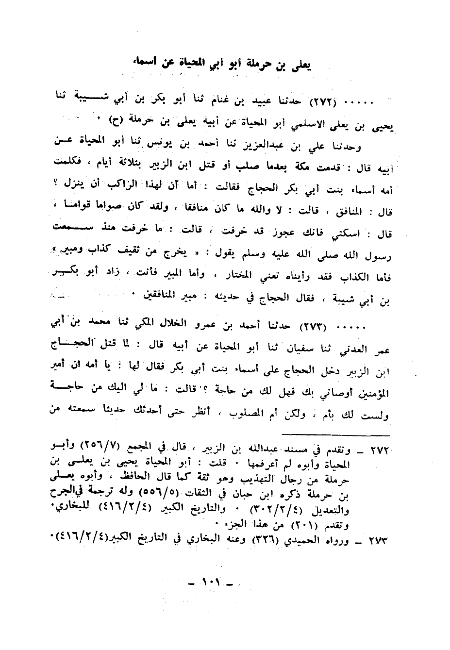 272 - حَدَّثَنَا عُبَيْدُ بْنُ غَنَّامٍ، ثنا أَبُو بَكْرِ بْنِ أَبِي شَيْبَةَ، ثنا يَحْيَى بْنُ يَعْلَى الْأَسْلَمِيُّ أَبُو الْمُحَيَّاةِ، عَنْ أَبِيهِ يَعْلَى بْنِ حَرْمَلَةَ، ح وَحَدَّثَنَا عَلِيُّ بْنُ عَبْدِ الْعَزِيزِ، ثنا أَحْمَدُ بْنُ يُونُسَ، ثنا أَبُو الْمُحَيَّاةِ، عَنْ أَبِيهِ، قَالَ: قَدِمْتُ مَكَّةَ بَعْدَمَا صُلِبَ أَوْ قُتِلَ ابْنُ الزُّبَيْرِ بِثَلَاثَةِ أَيَّامٍ، فَكَلَّمَتُ أُمُّهُ أَسْمَاءُ بِنْتُ أَبِي بَكْرٍ الْحَجَّاجَ، فَقَالَتْ: أَمَا آنْ لِهَذَا الرَّاكِبِ أَنْ يَنْزِلَ؟ قَالَ: الْمُنَافِقُ، قَالَتْ: لَا وَاللهِ مَا كَانَ مُنَافِقًا، وَلَقَدْ كَانَ صَوَّامًا قِوَامًا، قَالَ: اسْكُتِي فَإِنَّكِ عَجُوزٌ قَدْ خَرِفْتِ، قَالَتْ: مَا خَرِفْتُ، مُنْذُ سَمِعْتُ رَسُولَ اللهِ صَلَّى اللهُ عَلَيْهِ وَسَلَّمَ يَقُولُ: «§يَخْرُجُ مِنْ ثَقِيفٍ كَذَّابٌ وَمُبِيرٌ» فَأَمَّا الْكَذَّابُ فَقَدْ رَأَيْنَاهُ تَعْنِي الْمُخْتَارَ، وَأَمَّا الْمُبِيرُ فَأَنْتَ " زَادَ أَبُو بَكْرِ بْنُ أَبِي شَيْبَةَ: فَقَالَ الْحَجَّاجُ فِي حَدِيثِهِ مُبِيرُ الْمُنَافِقِينَ