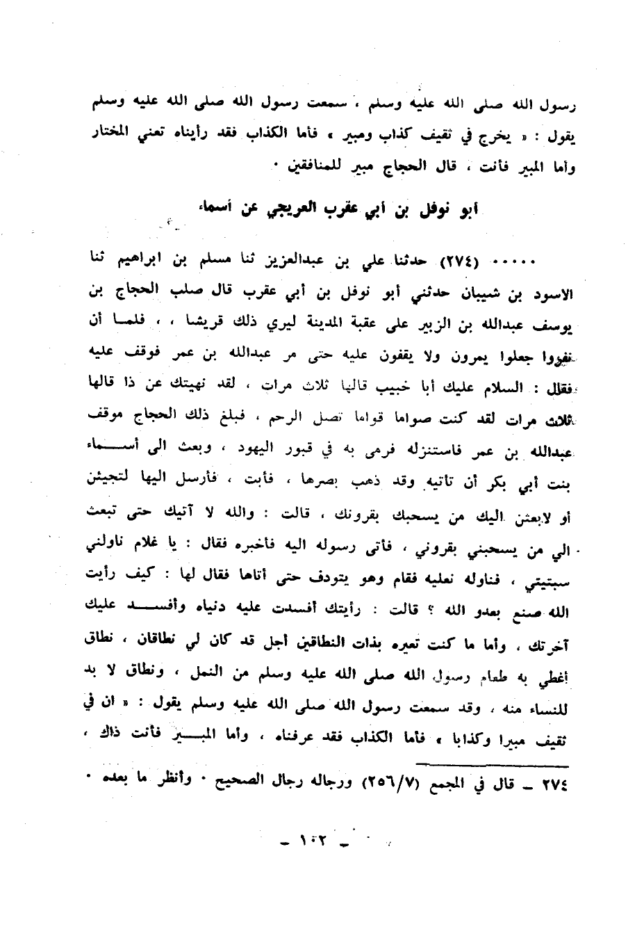 274 - حَدَّثَنَا عَلِيُّ بْنُ عَبْدِ الْعَزِيزِ، ثنا مُسْلِمُ بْنُ إِبْرَاهِيمَ، ثنا الْأَسْوَدُ بْنُ شَيْبَانَ، حَدَّثَنِي أَبُو نَوْفَلِ بْنُ أَبِي عَقْرَبٍ، قَالَ: صَلَبَ الْحَجَّاجُ بْنُ يُوسُفَ عَبْدَ اللهِ بْنَ الزُّبَيْرِ عَلَى عَقَبَةِ الْمَدِينَةِ لِيُرِي ذَلِكَ قُرَيْشًا، فَلَمَّا أَنْ نَفَرُوا جَعَلُوا يَمُرُّونَ وَلَا يَقِفُونَ عَلَيْهِ حَتَّى مَرَّ عَبْدُ اللهِ بْنُ عُمَرَ، فَوَقَفَ عَلَيْهِ فَقَالَ: السَّلَامُ عَلَيْكَ أَبَا خُبَيْبٍ قَالَهَا ثَلَاثَ مَرَّاتٍ، لَقَدْ نَهَيْتُكَ عَنْ ذَا، قَالَهَا ثَلَاثَ مَرَّاتٍ، لَقَدْ كُنْتَ صَوَّامًا قَوَّامًا تَصِلُ الرَّحِمَ، فَبَلَغَ ذَلِكَ الْحَجَّاجَ مَوْقِفُ عَبْدِ اللهِ بْنِ عُمَرَ فَاسْتَنْزَلَهُ فَرَمَى بِهِ فِي قُبُورِ الْيَهُودِ، وَبَعَثَ إِلَى أَسْمَاءَ بِنْتِ أَبِي بَكْرٍ أَنْ تَأْتِيَهُ، وَقَدْ ذَهَبَ بَصَرُهَا، فَأَبَتْ فَأَرْسَلَ إِلَيْهَا لَتَجِيئَنَّ أَوْ لَأَبْعَثَنَّ إِلَيْكِ مَنْ يَسْحَبُكِ بِقُرُونِكِ، قَالَتْ: وَاللهِ لَا آتِيَكَ حَتَّى تَبْعَثَ إِلَيَّ مَنْ يَسْحَبُنِي بِقُرُونِي، فَأَتَى رَسُولَهُ إِلَيْهِ فَأَخْبَرَهُ فَقَالَ: يَا غُلَامُ نَاوِلْنِي سِبْتِيَّتِي، فَنَاوَلَهُ نَعْلَيْهِ فَقَامَ وَهُوَ يَتَوَدَّفُ حَتَّى أَتَاهَا، فَقَالَ لَهَا: كَيْفَ رَأَيْتِ اللهَ صَنَعَ بِعَدُوِّ اللهِ، قَالَتْ: رَأَيْتُكَ أَفْسَدْتَ عَلَيْهِ دُنْيَاهُ، وَأَفْسَدَ عَلَيْكَ آخِرَتَكَ، وَأَمَّا مَا كُنْتَ تُعَيِّرُهُ بِذَاتِ النِّطَاقَيْنِ، أَجَلْ قَدْ كَانَ لِي نِطاقانِ: نِطَاقٌ أُغَطِّي بِهِ طَعَامَ رَسُولِ اللهِ صَلَّى اللهُ عَلَيْهِ وَسَلَّمَ مِنَ النَّمْلِ، ونطاقٌ لَا بُدَّ لِلنِّسَاءِ مِنْهُ، وَقَدْ سَمِعْتُ رَسُولَ اللهِ صَلَّى اللهُ عَلَيْهِ وَسَلَّمَ يَقُولُ: «إِنَّ §فِي ثَقِيفٍ مُبِيرًا وَكَذَّابًا» فَأَمَّا الْكَذَّابُ فَقَدْ عَرَفْنَاهُ، وَأَمَّا الْمُبِيرُ فَأَنْتَ ذَاكَ قَالَ: فَخَرَجَ "