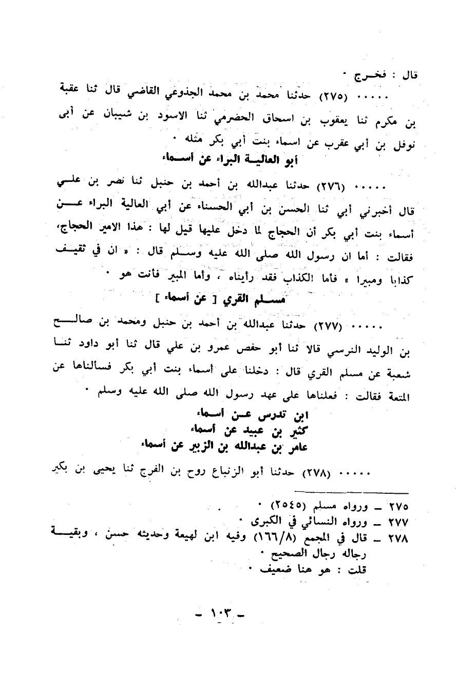 277 - حَدَّثَنَا عَبْدُ اللهِ بْنُ أَحْمَدَ بْنِ حَنْبَلٍ، وَمُحَمَّدُ بْنُ صَالِحِ بْنِ الْوَلِيدِ النَّرْسِيُّ، قَالَا: ثنا أَبُو حَفْصٍ عَمْرُو بْنُ عَلِيٍّ، قَالَ: ثنا أَبُو دَاوُدَ، ثنا شُعْبَةُ، عَنْ مُسْلِمٍ الْقُرِّيِّ، قَالَ: دَخَلْنَا عَلَى أَسْمَاءَ بِنْتِ أَبِي بَكْرٍ فَسَأَلْنَاهَا عَنِ §الْمُتْعَةِ، فَقَالَتْ: «فَعَلْنَاهَا عَلَى عَهْدِ رَسُولِ اللهِ صَلَّى اللهُ عَلَيْهِ وَسَلَّمَ»